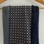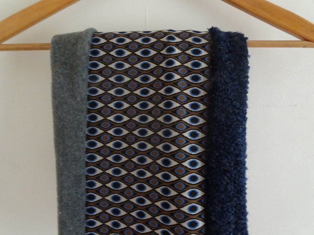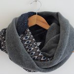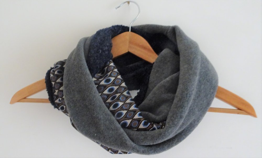 snood trois tissus : polaire grise chiné, jersey gris et bleu et maille bouclette bleu marine
