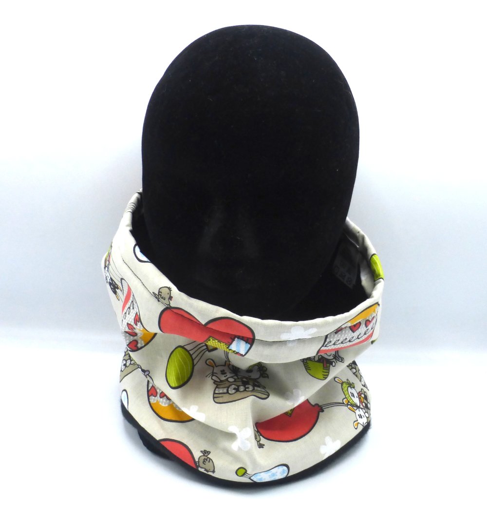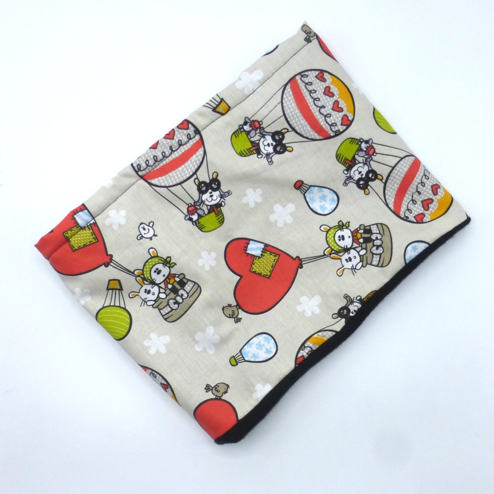 Snood multicolore à motif lapins dans une montgolfière en coton imprimé et polaire noire pour enfant.