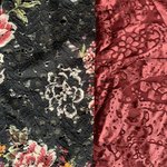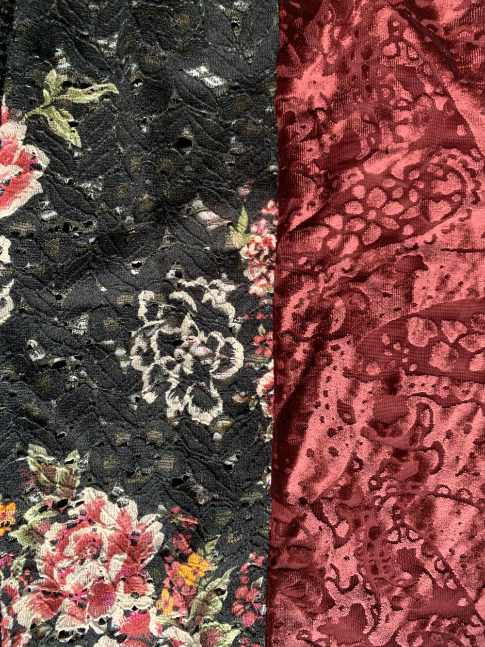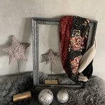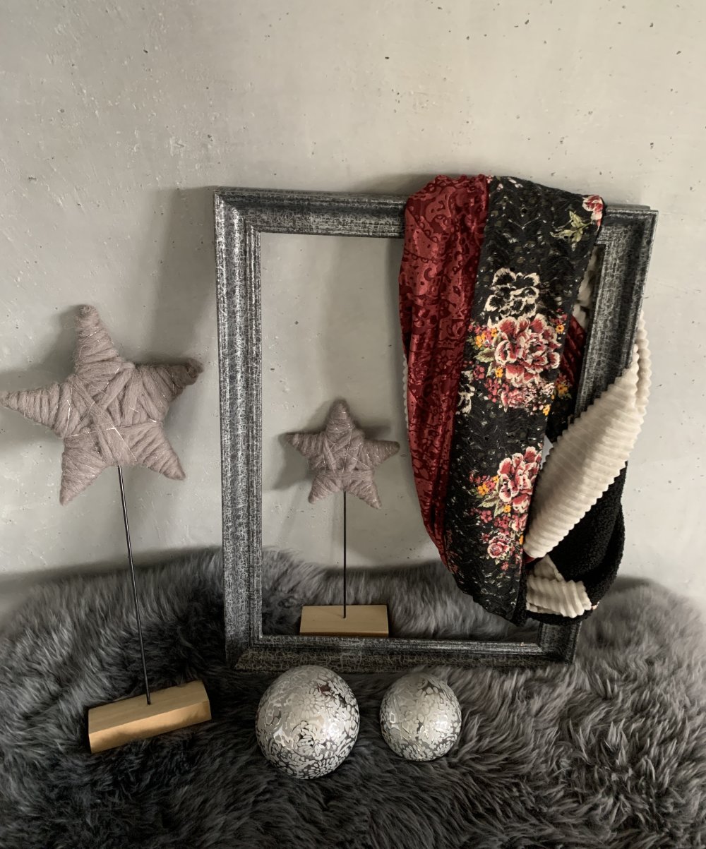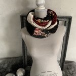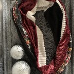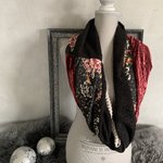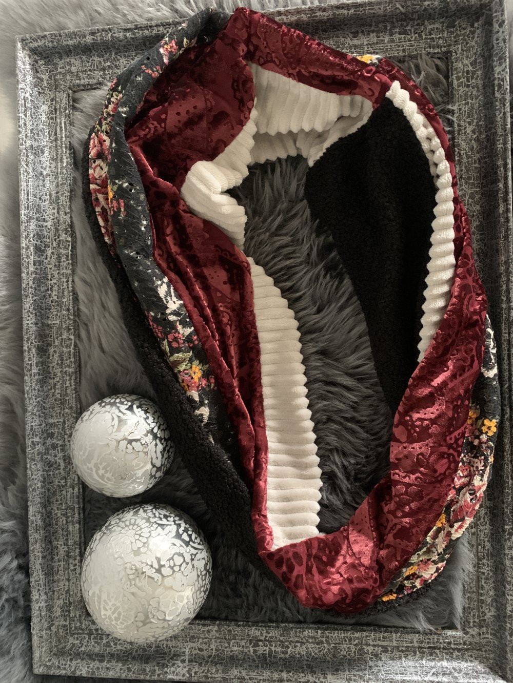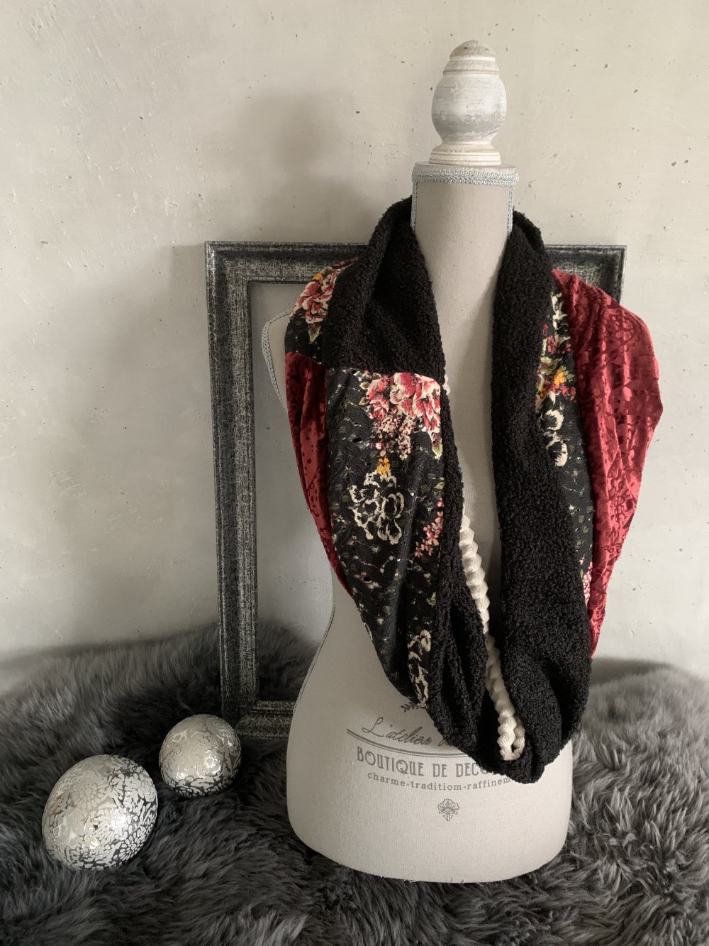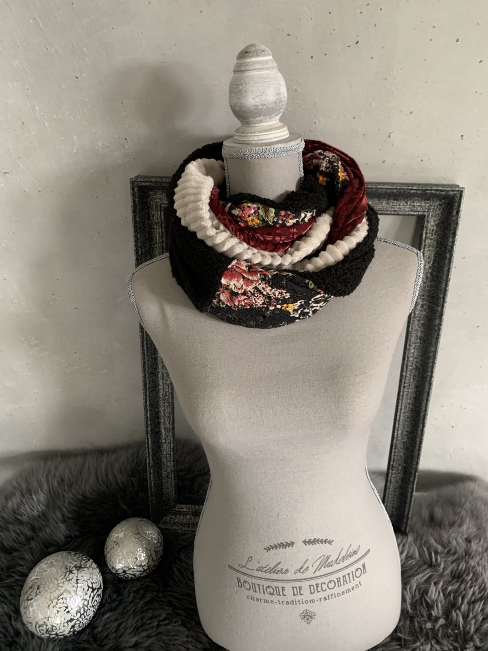 Snood réalisé dans quatre matières : - une maille velours minkee stripe gris clair - une maille façon astrakan noir - une maille velours à motifs ton sur ton bordeaux - une dentelle de coton imprimée fleurs