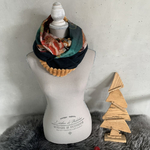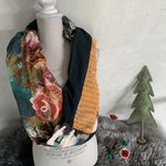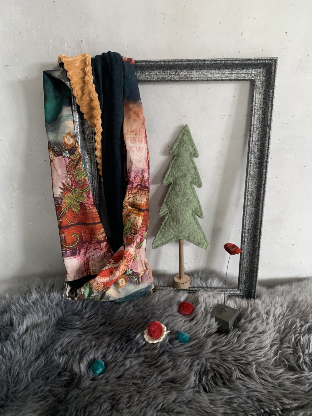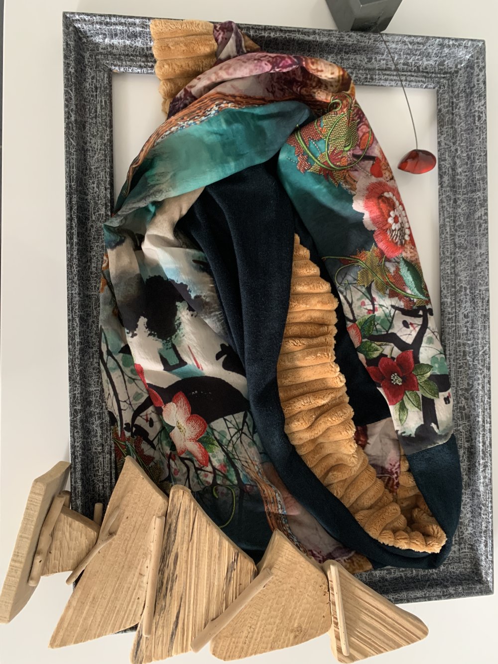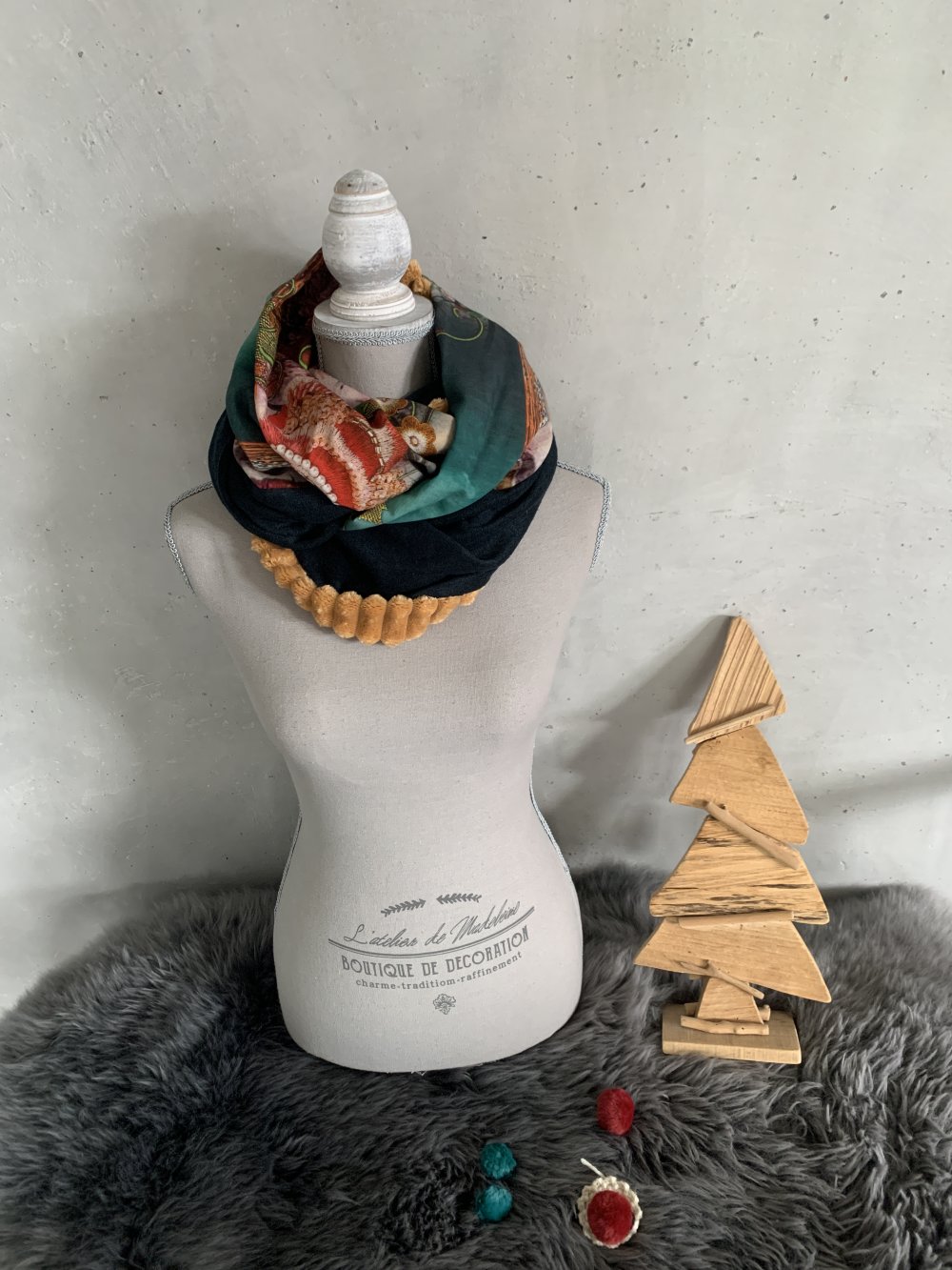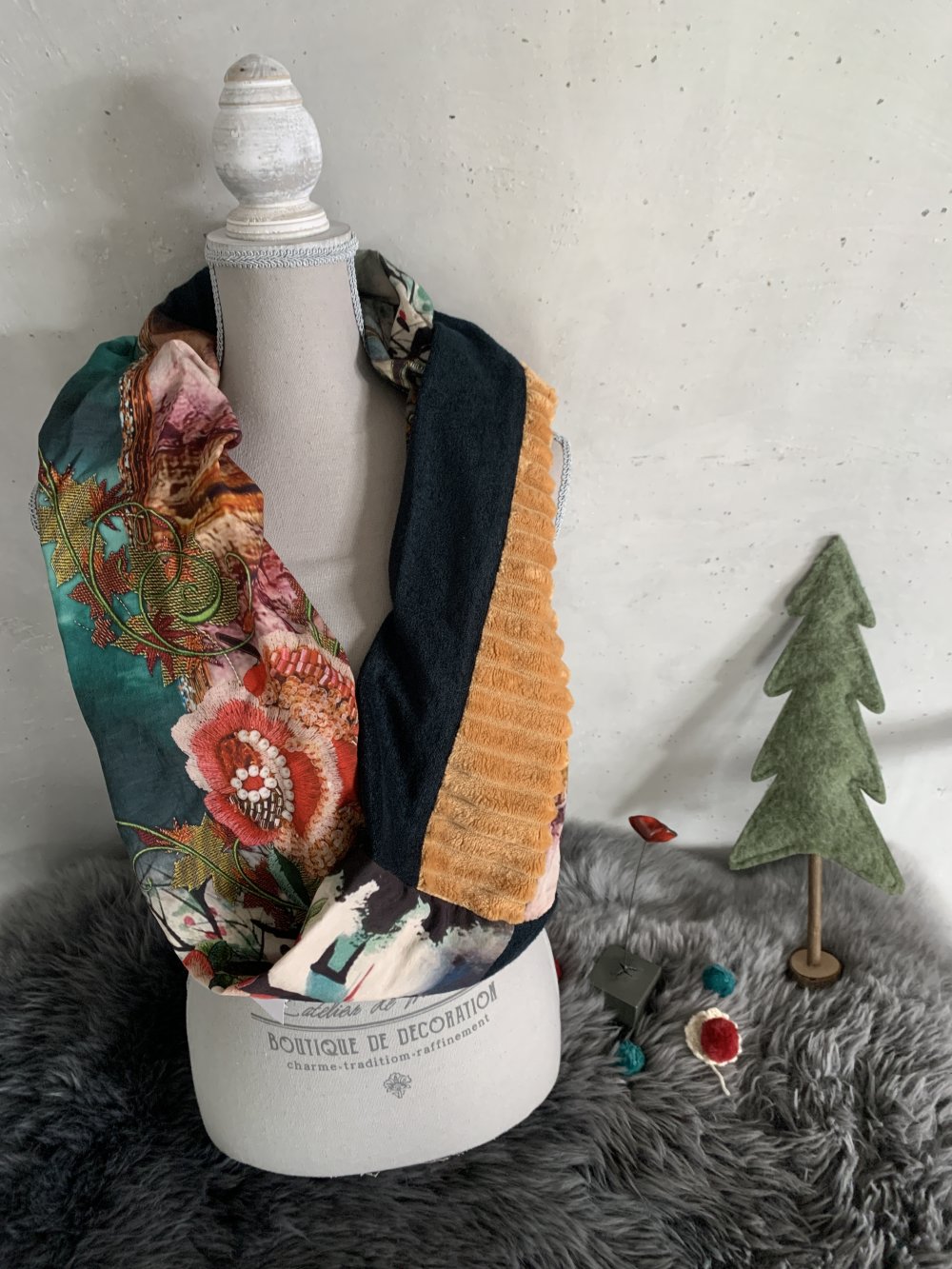 Snood réalisé dans trois matières : - une maille velours minkee stripe camel - une maille éponge verte foncée - un tissu imprimé fleurs brodées esprit couture