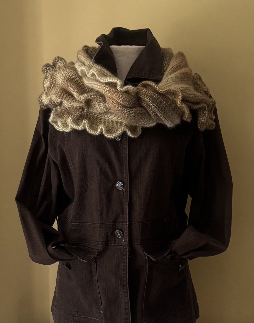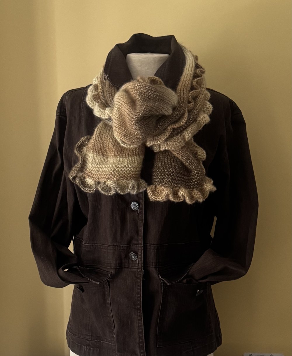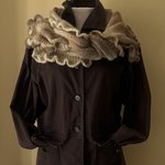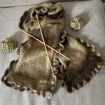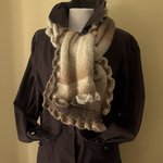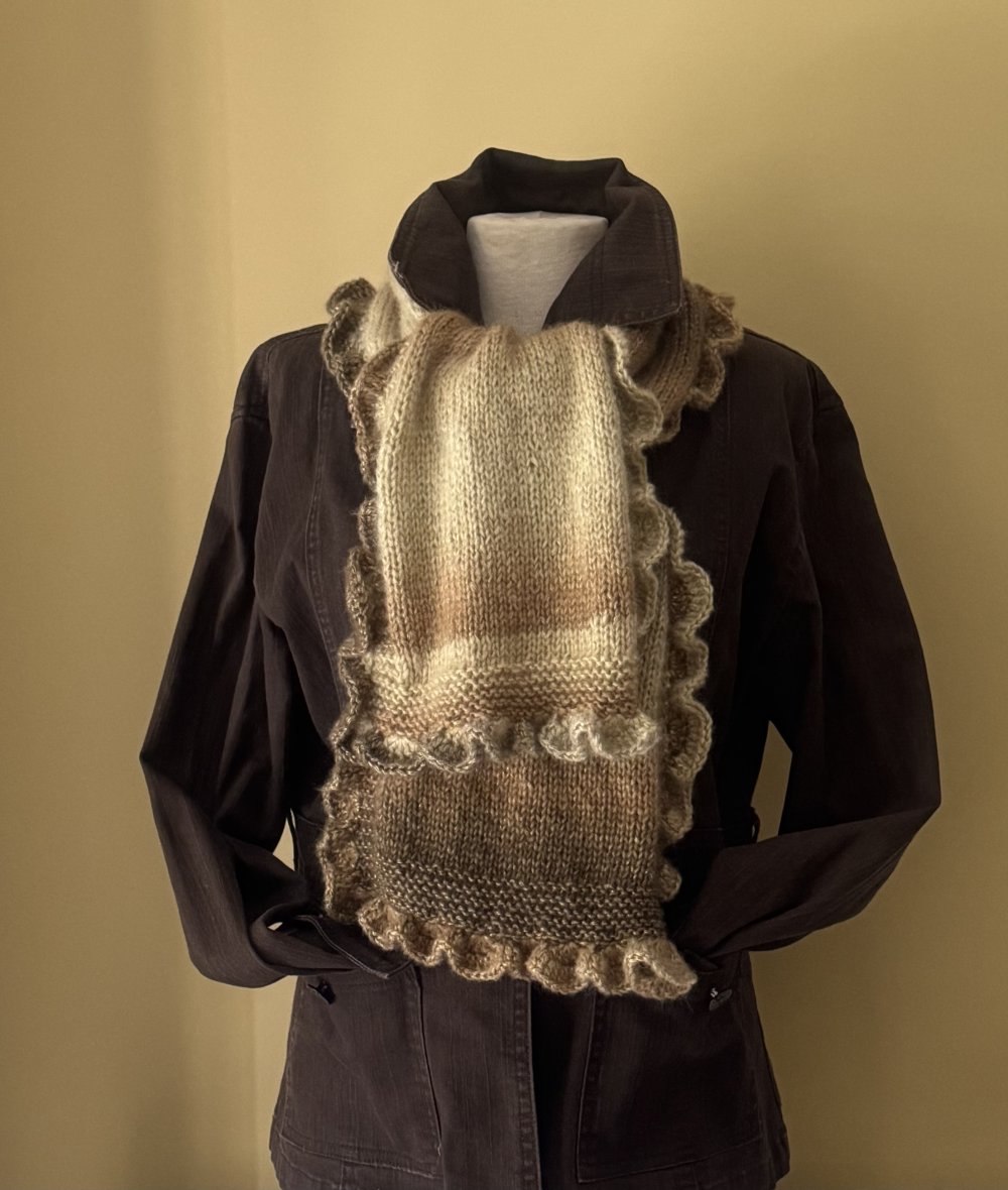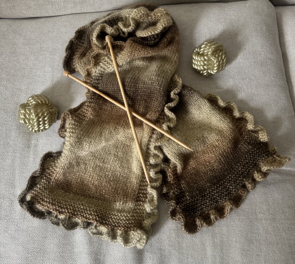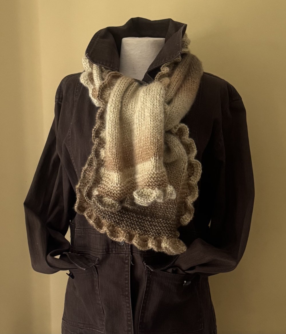 Cette étole est tricotée en point jersey et mousse avec en finition un tour frou frou au crochet .