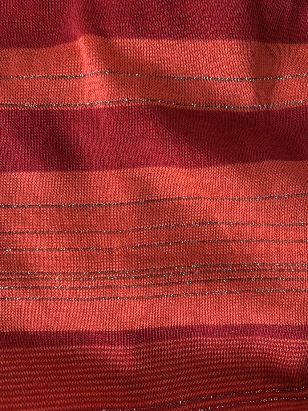 - un jersey rayé dans des camaïeux rouge agrémentés de fils dorés.