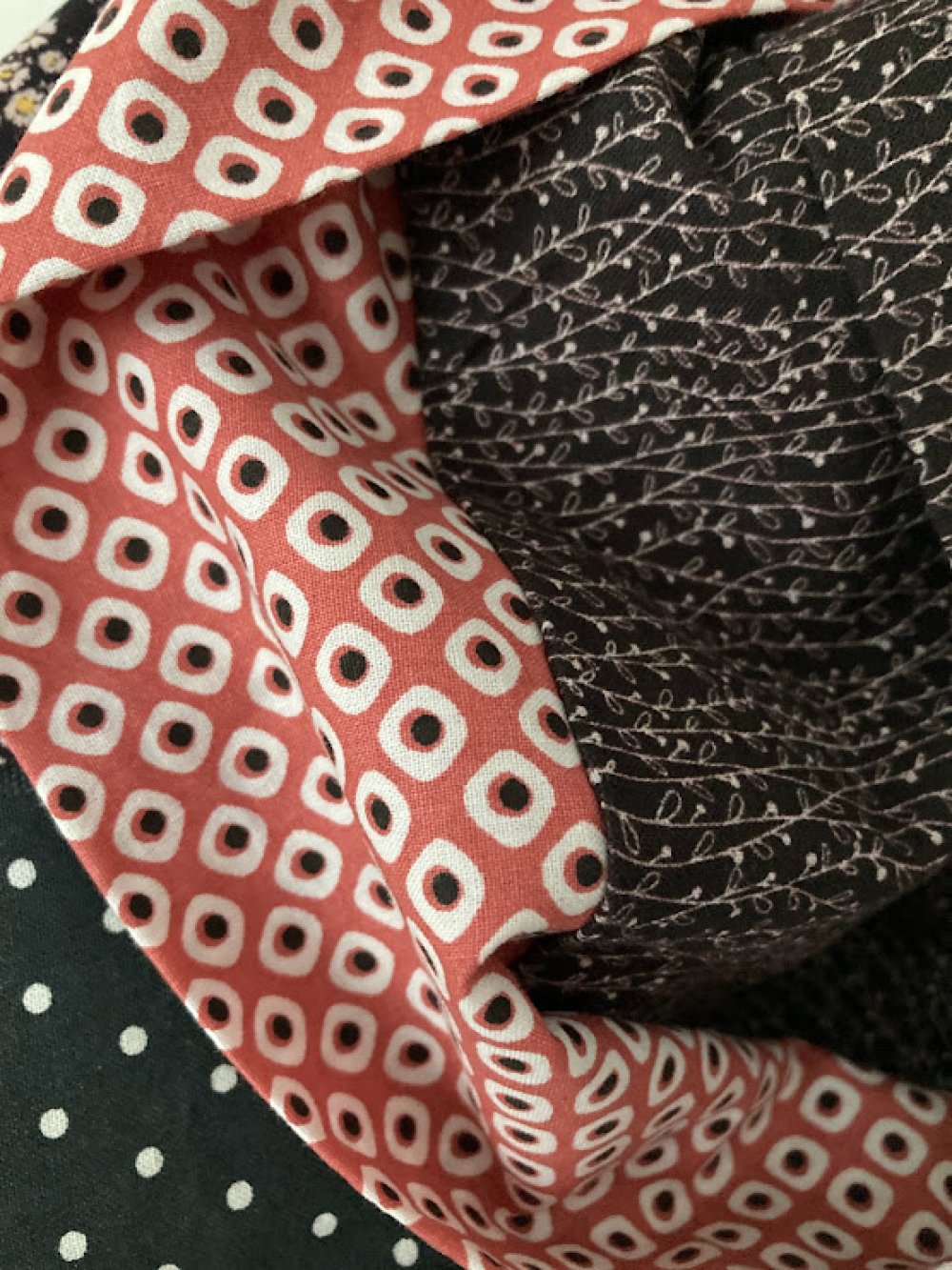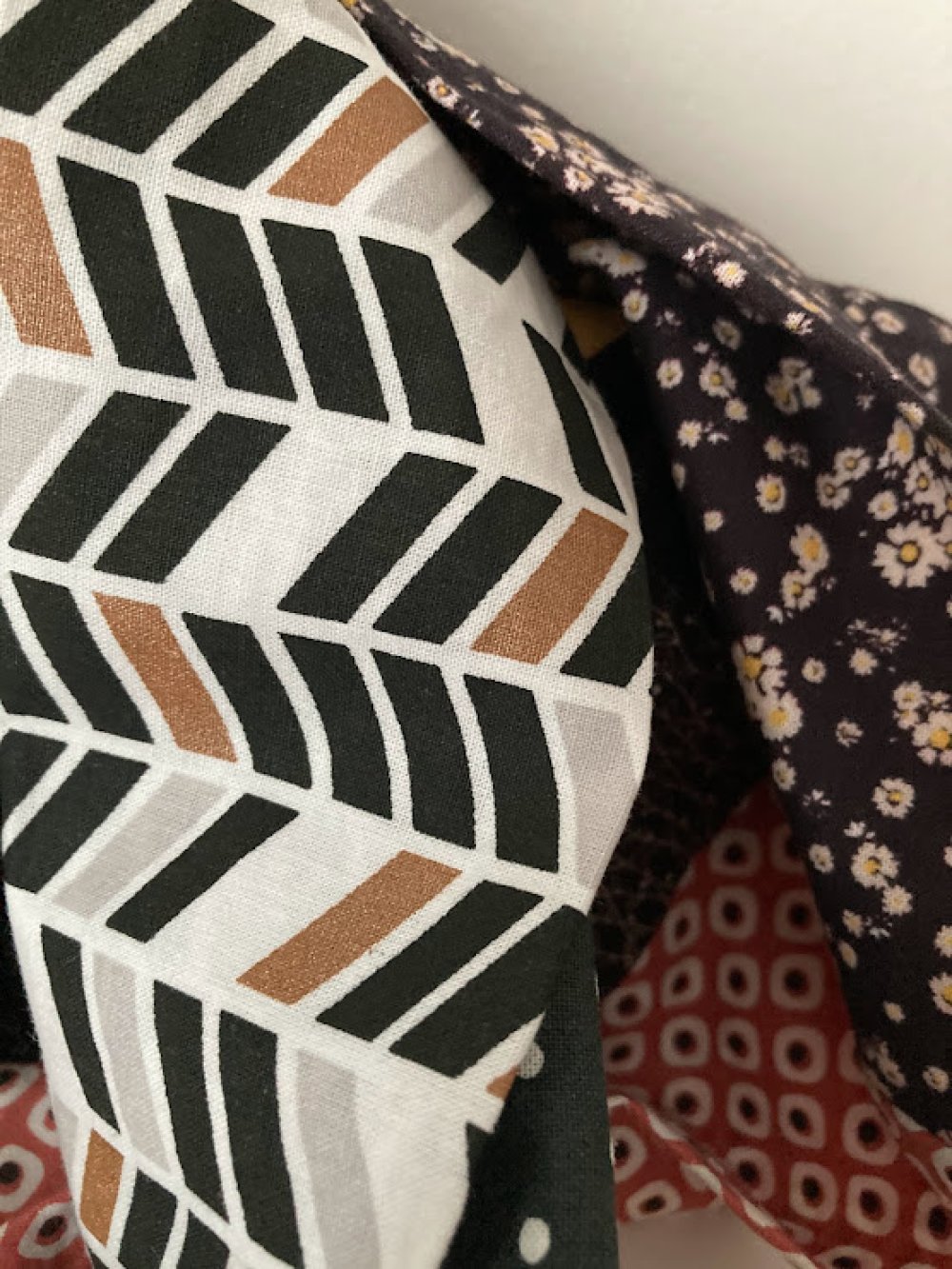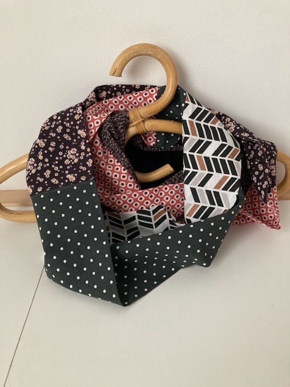 Snood femme composé de plusieurs tissus assortis ( coton).La longueur permet de faire deux tours de cou afin accessoiriser joliment une tenue.
