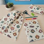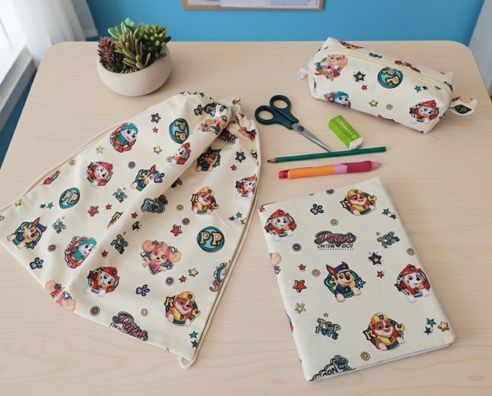 Ensemble pour une rentrée scolaire réussie composé d'une trousse, d'une serviette de cantine et un protège cahier en tissu coton certifié Oeko-Tex de couleur beige à motifs personnages de la Pat Patrouille