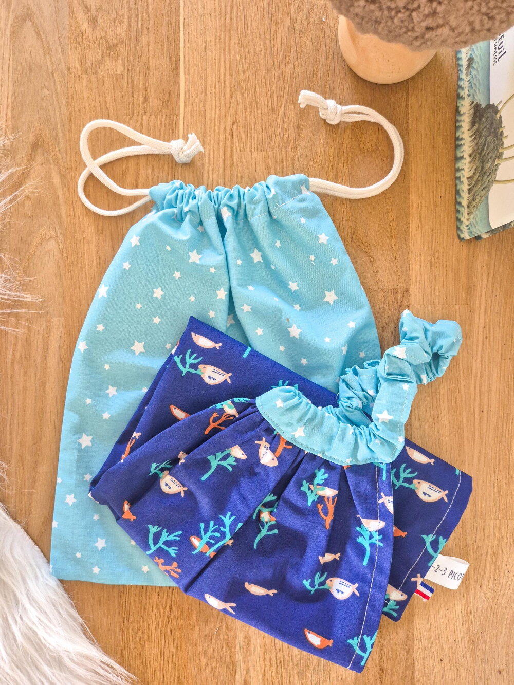Pour une tenue pratique , la grande serviette s'enfile par la tête avec son pochon de rangement, pratique à glisser dans son cartable.