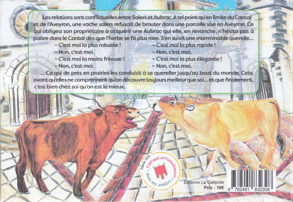 Conte d'Auvergne pour enfants dès 7 ans. Convient aux lecteurs débutants. C'est l'histoire de deux vaches, de races Salers et Aubrac, qui se disputent pour savoir qui est la meilleure. à force de se disputer, elles finissent par sortir de leur parcelle, et même faire un tour du monde! Et partout, elles trouvent meilleur qu'elles. Alors, elles finissent par rentrer chez elles...