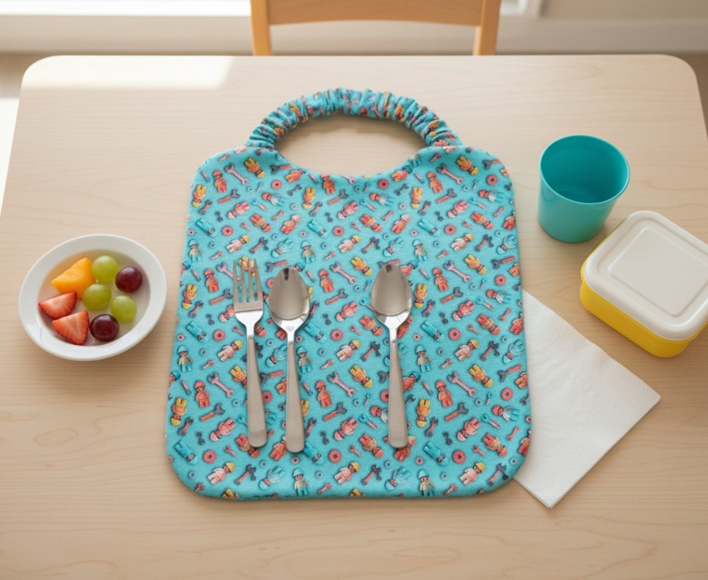Serviette de table, serviette de cantine élastique doublée pour enfant / motif ouvriers style Playmobil effet 3D