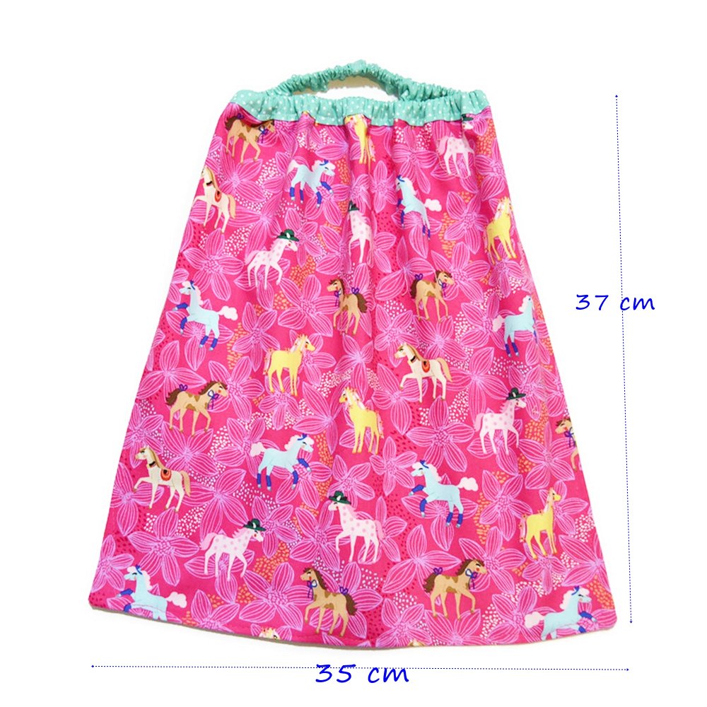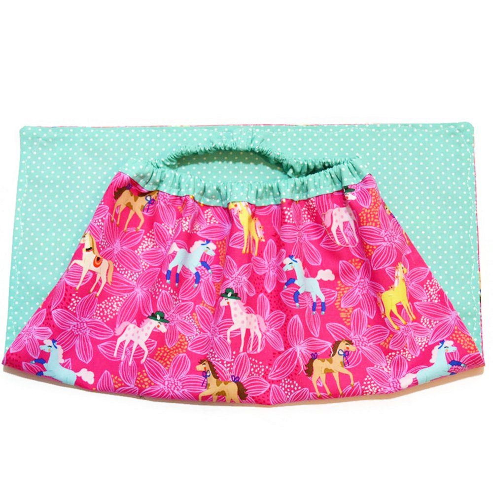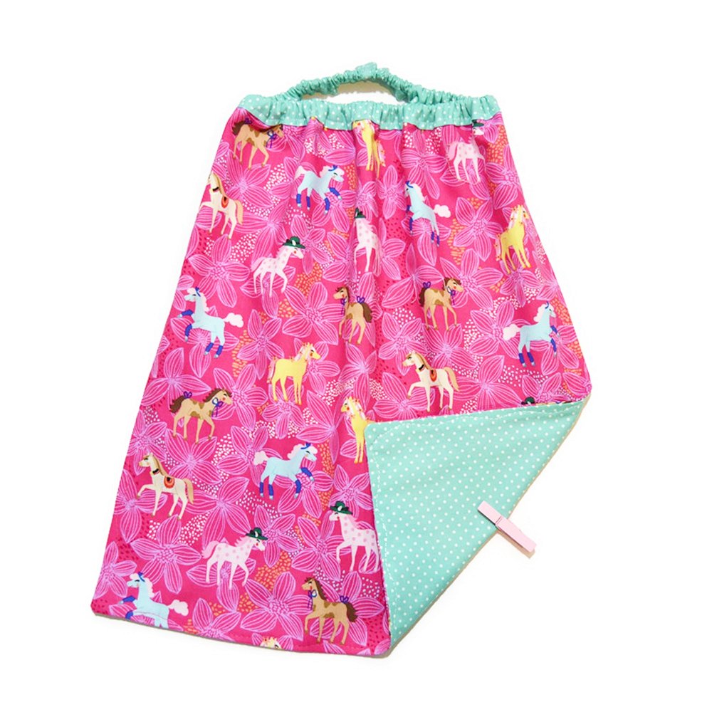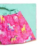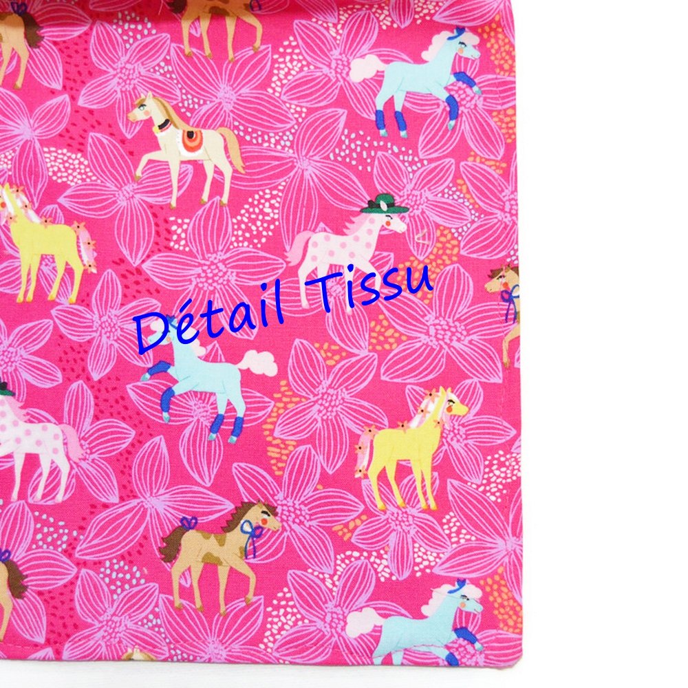 - Le premier tissu est imprimé, sur fond Fuchsia, de petits Poneys amusants et colorés, de fleurs en filigrane, de petits points colorés.