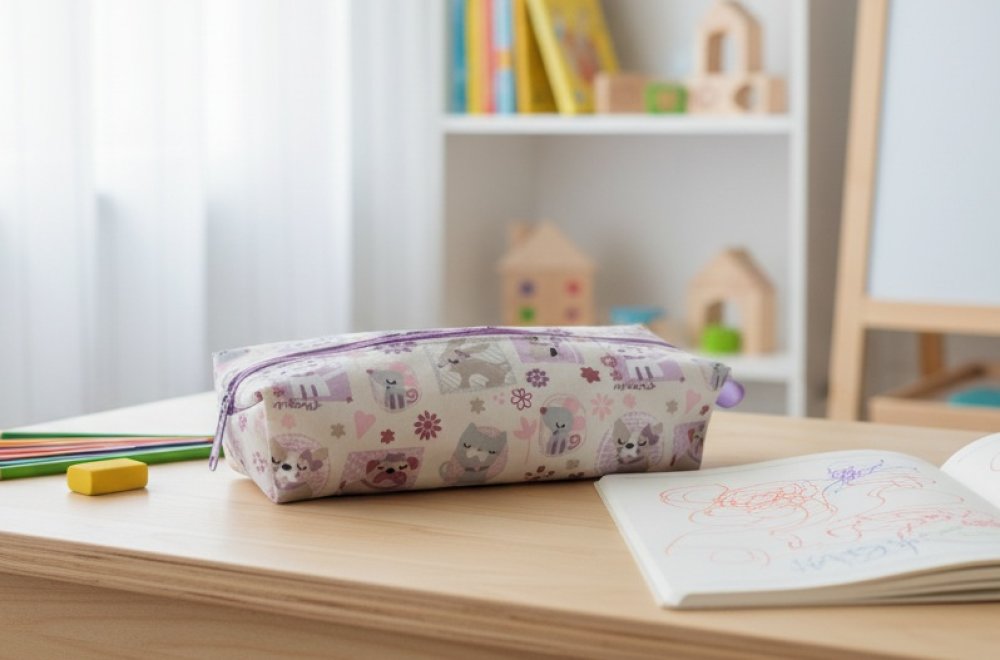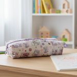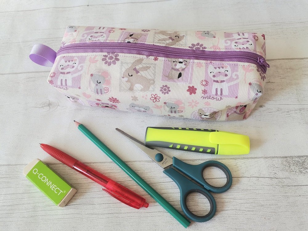 Trousse zippée en coton certifié Oeko-Tex motif animaux sur fond beige intérieur doublé d'un tissu polyester de couleur rose et blanc - Entoilage de renfort pour le tissu principal - Fermeture zippée de couleur lilas avec petite dragonne