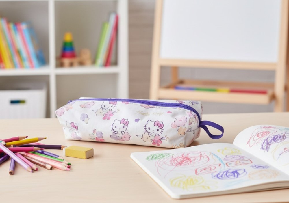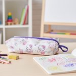 Trousse zippée en coton certifié Oeko-Tex motif Hello Kitty sur fond blanc intérieur doublé d'un tissu polyester de couleur rose et motif fleur - Entoilage de renfort pour le tissu principal - Fermeture zippée de couleur violet avec petite dragonne