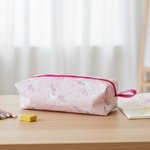 Trousse zippée en coton certifié Oeko-Tex motif licornes sur fond rose intérieur doublé d'un tissu polyester de couleur rose et blanc - Entoilage de renfort pour le tissu principal - Fermeture zippée de couleur rose foncé avec petite dragonne