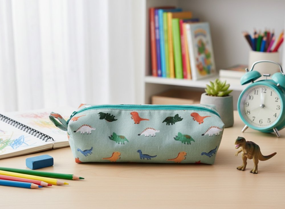 Trousse zippée en coton certifié Oeko-Tex motif dinosaures intérieur doublé d'un tissu coton de couleur verte - Entoilage de renfort pour le tissu principal et tissu doublure - Fermeture zippée de couleur verte