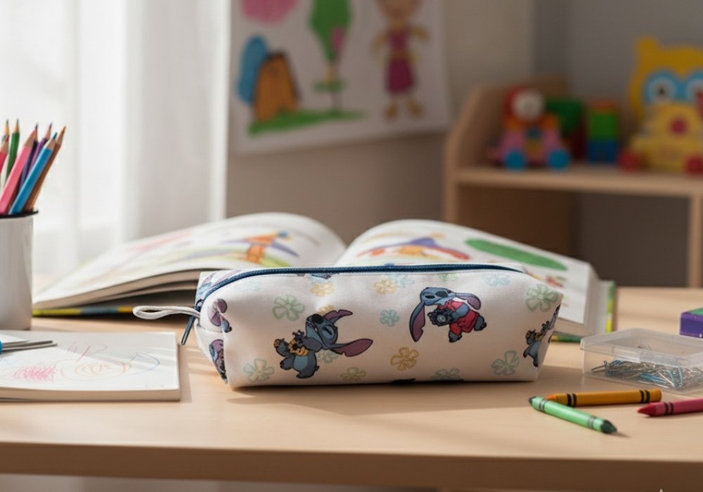 Trousse zippée en coton certifié Oeko-Tex motif Stitch intérieur doublé d'un tissu coton uni blanc - Entoilage de renfort pour le tissu principal et tissu doublure - Fermeture zippée de couleur bleu turquoise