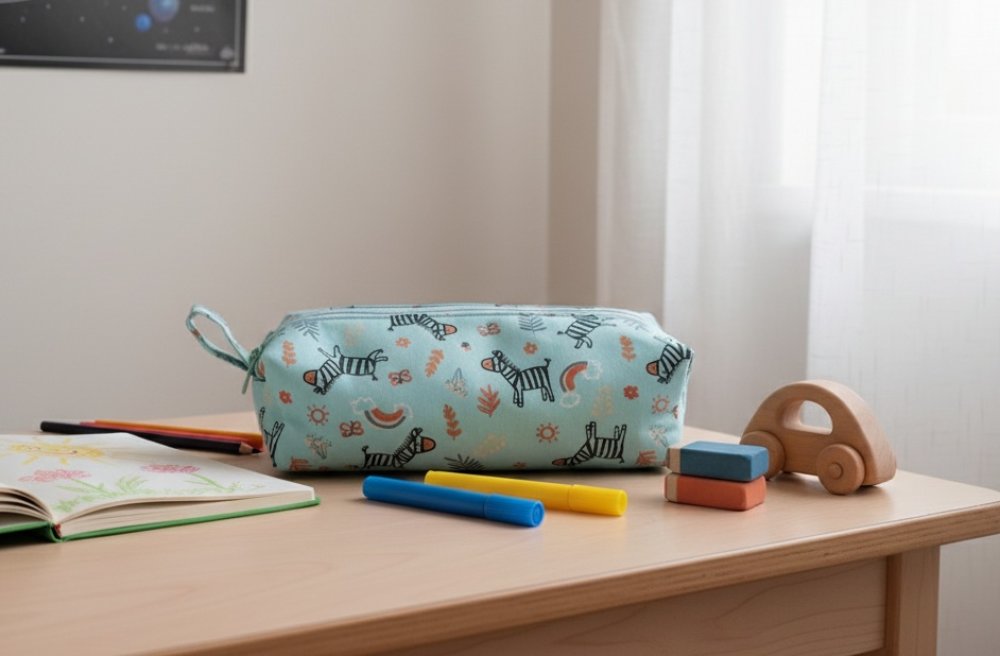 Trousse zippée en coton certifié Oeko-Tex motif zèbres intérieur doublé d'un tissu coton de couleur bleu - Entoilage de renfort pour le tissu principal et tissu doublure - Fermeture zippée de couleur bleu ciel