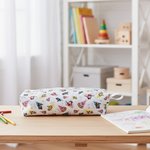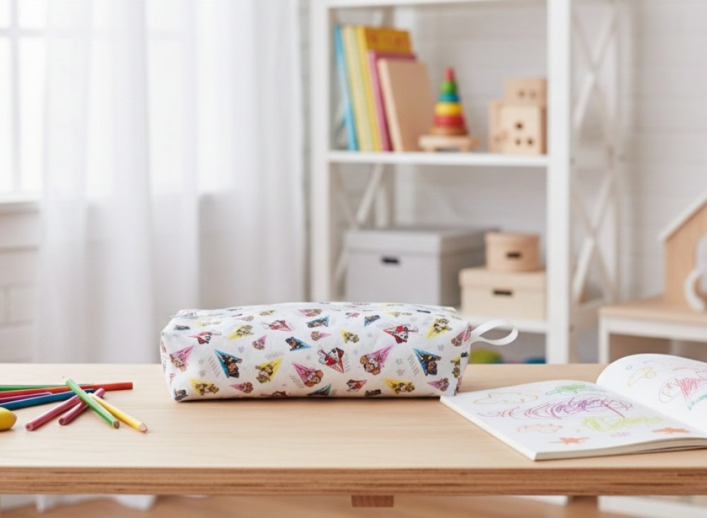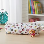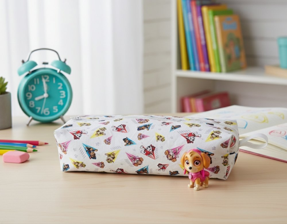 Trousse zippée en coton certifié Oeko-Tex motif Pat Patrouille sur fond blanc intérieur doublé d'un tissu polyester de couleur bleu clair - Entoilage de renfort pour le tissu principal - Fermeture zippée de couleur blanche avec petite dragonne