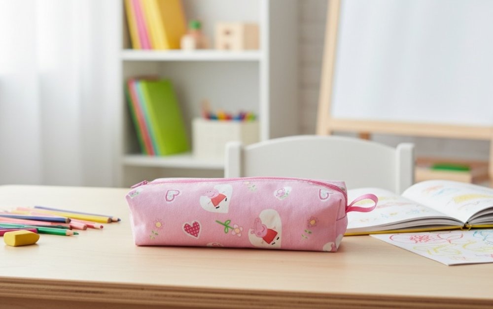 Trousse zippée en coton certifié Oeko-Tex motif Peppa Pig sur fond rose intérieur doublé d'un tissu polyester de couleur blanc et rose - Entoilage de renfort pour le tissu principal - Fermeture zippée de couleur rose avec petite dragonne