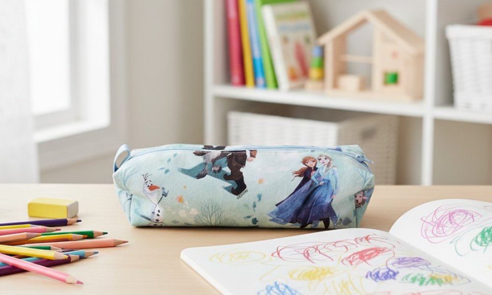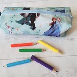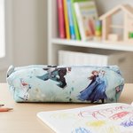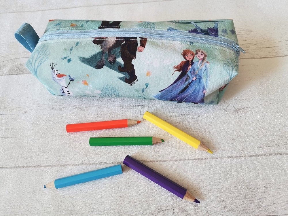 Trousse zippée en coton certifié Oeko-Tex motif Reine des neiges sur fond bleu ciel intérieur doublé d'un tissu polyester de couleur bleu à motifs - Entoilage de renfort pour le tissu principal - Fermeture zippée de couleur bleu ciel avec petite dragonne