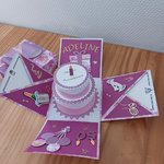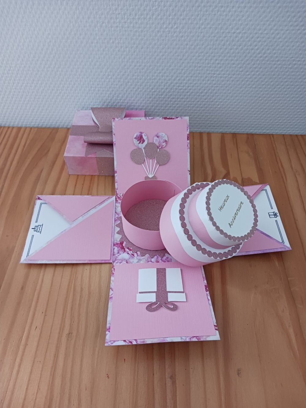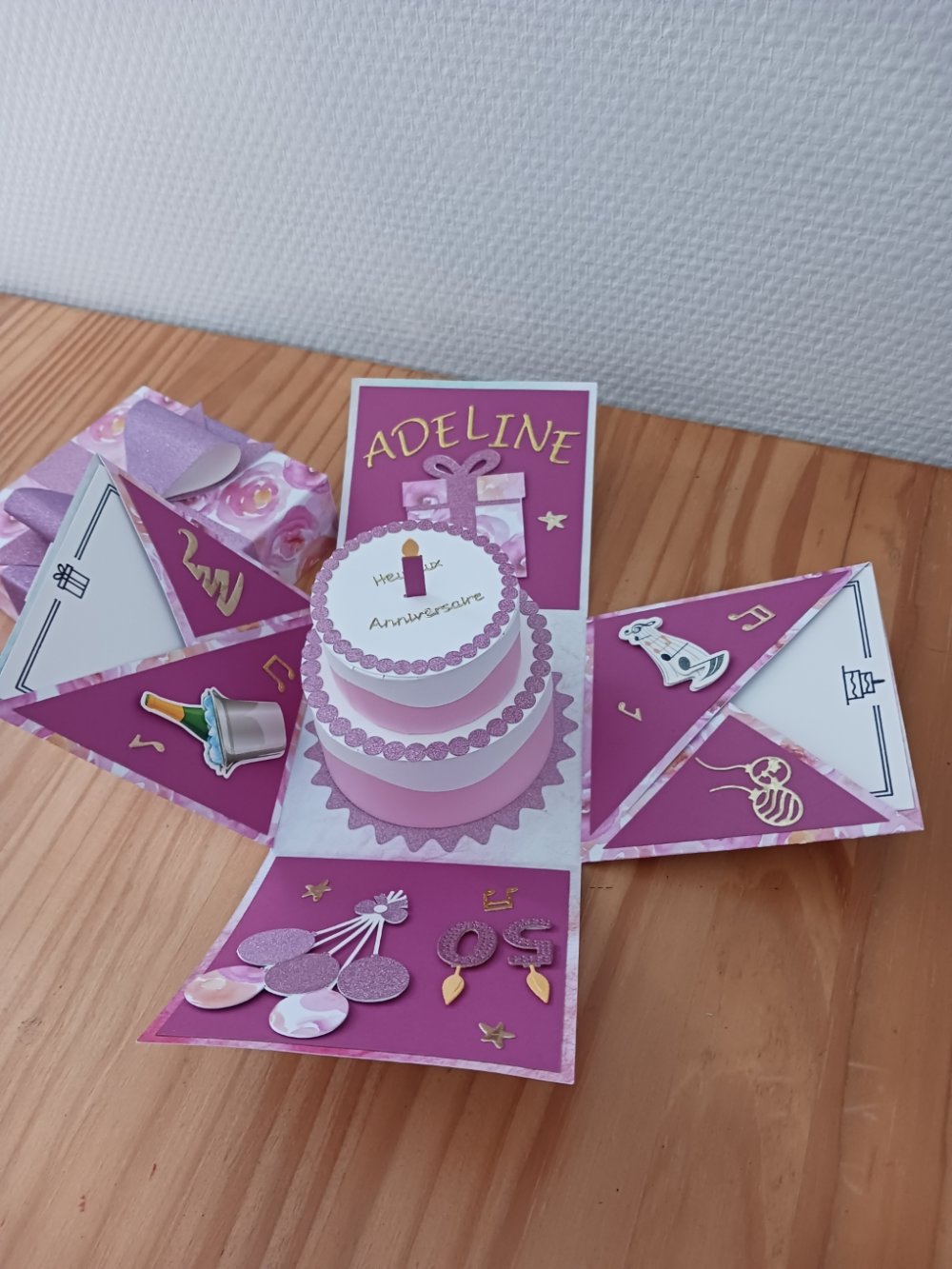 Surprenez votre entourage avec cette jolie boite cadeau "explosion" pour fêter un évenement. Vous soulevez le couvercle et apparait un joli gâteau qui s'ouvre aussi pour y mettre un présent, bonbons, bijoux, etc... Et sur les côés, vous pouvez y mettre un mot. (Fait en carton par mes soins) Je peux personnaliser la boite à votre convenance. (N'hésitez pas à m'envoyer un message avec vos souhaits.)