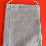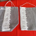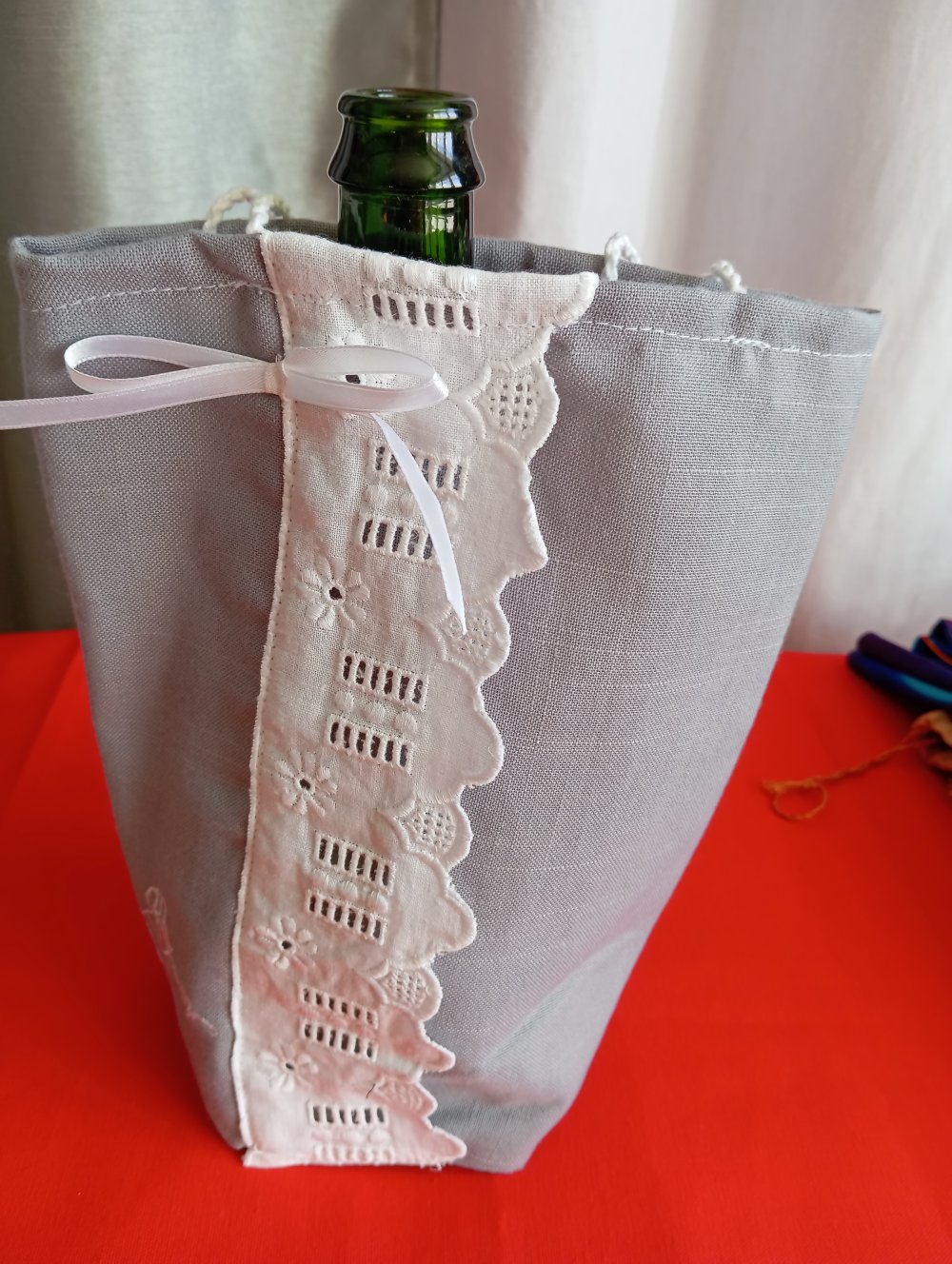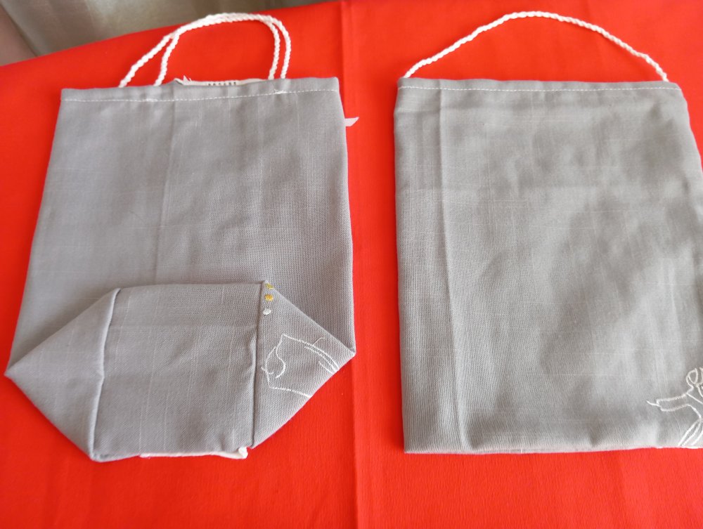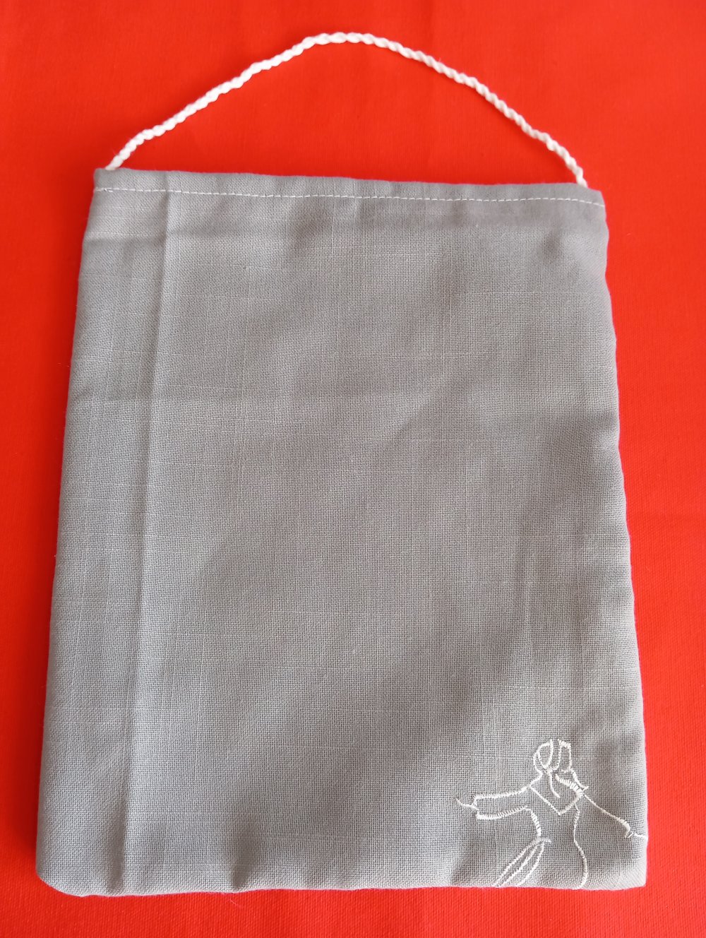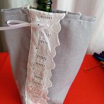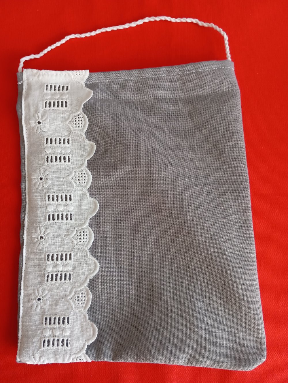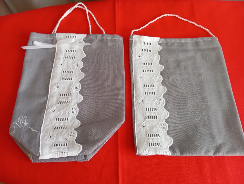 lot de 2 sachets cadeaux en polyester gris et bande broderie anglaise blanche , petite broderie femme stylisée sur le côté. Tissu recyclé à partir 2 serviettes de table achetées au poids chez Emmaùs. Ces sacs peuvent se laver et resservir des centaines de fois ce qui en fait des emballages durable .