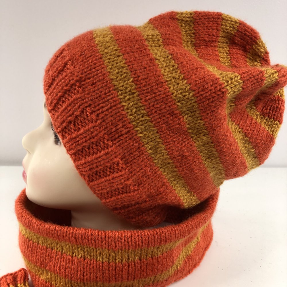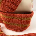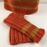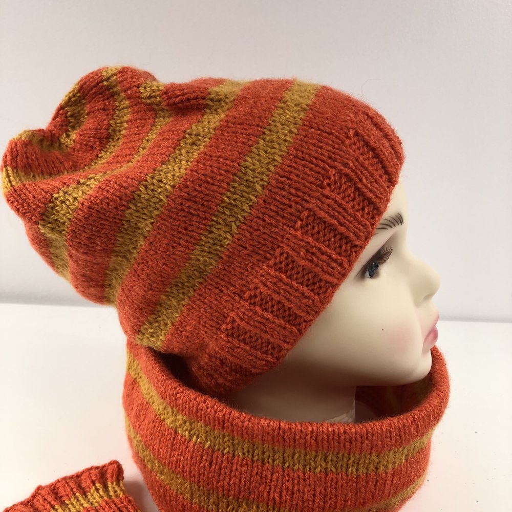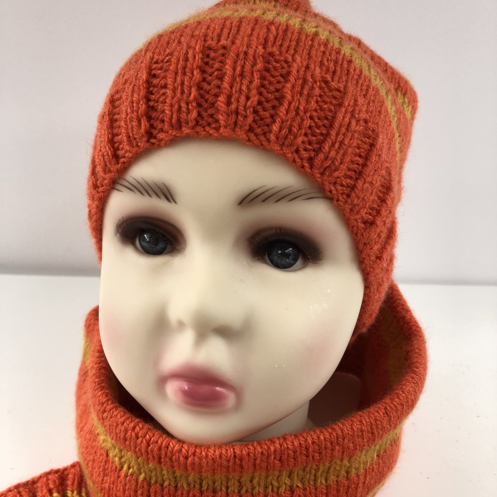 Ensemble Enfant Bonnet/Snood/Mitaines Laine Tricoté Main Réf 4080 Qualité Acrylique Couleur Orange/Jaune Taille 4/6 ans Modèle Unique