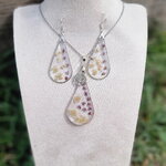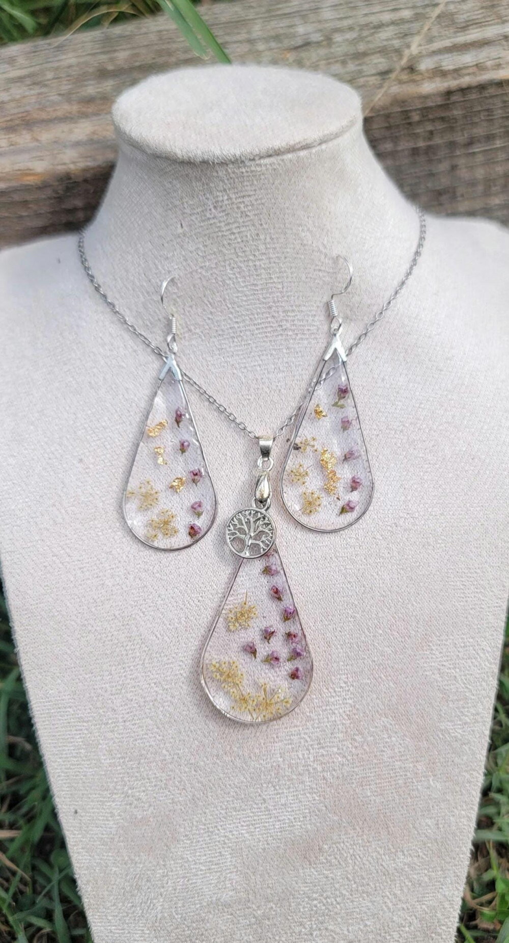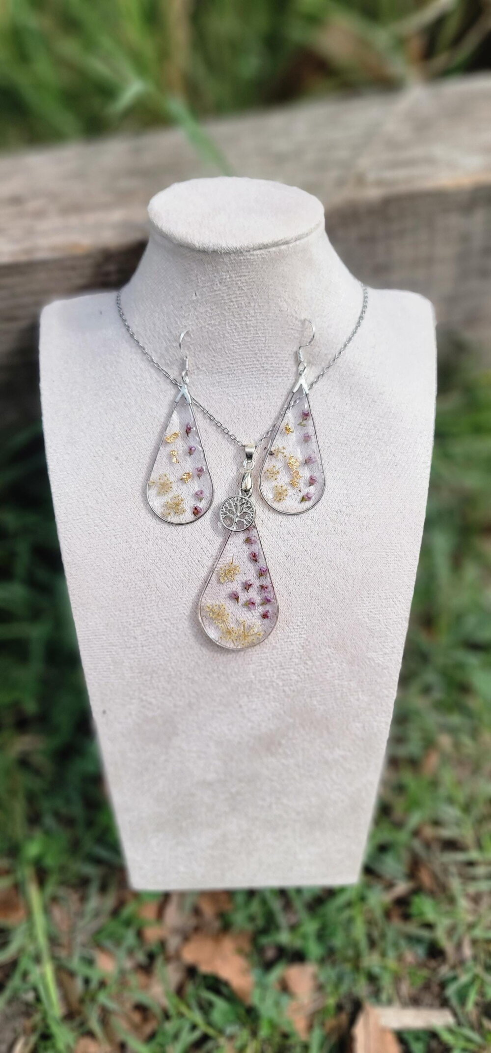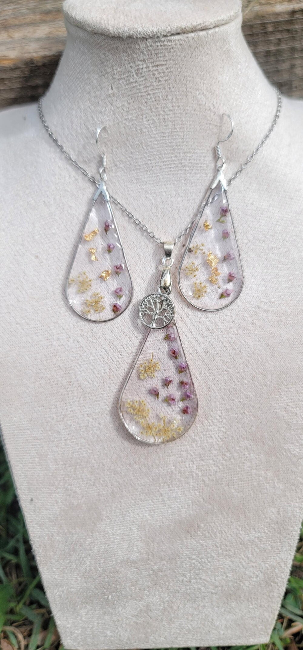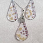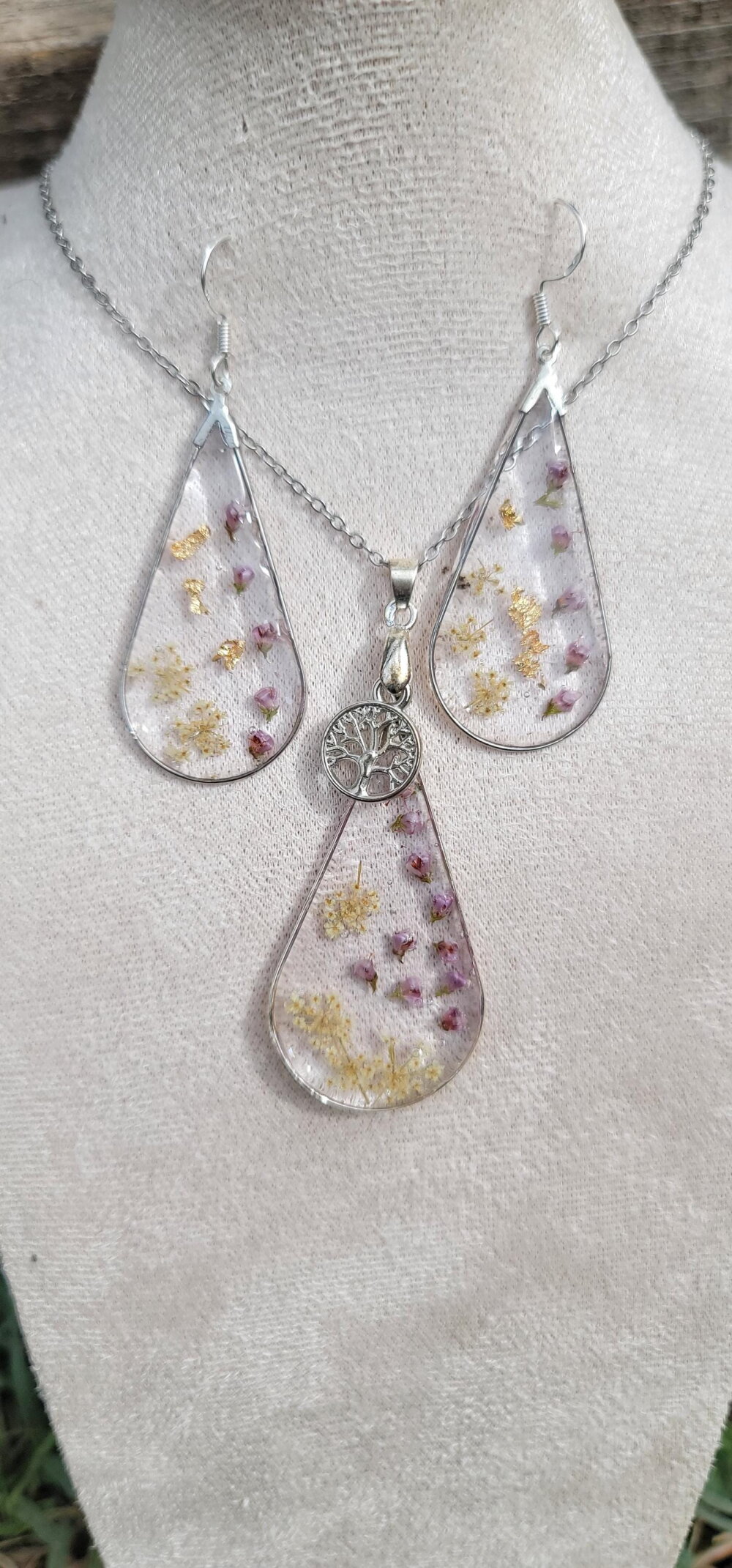 Ensemble collier et boucles d'oreilles en argent fleurs séchées en résine fleurs de pensées fait main idée cadeau éternelle pièce unique