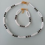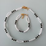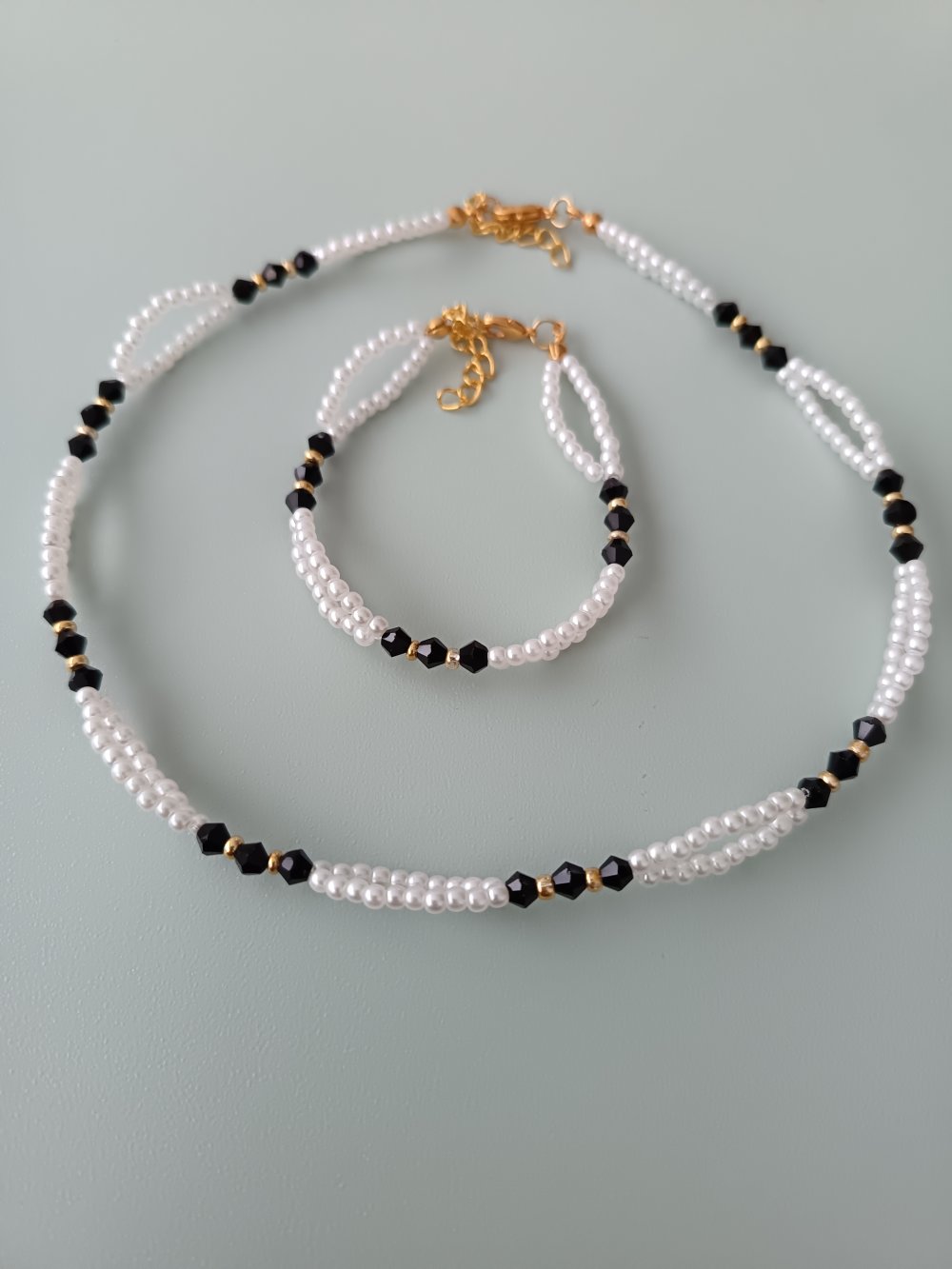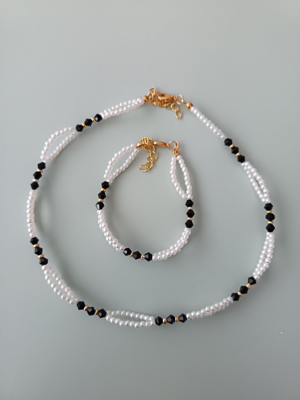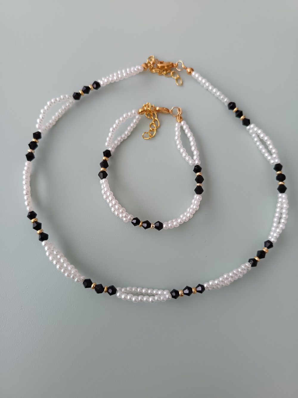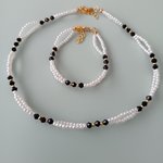 Découvrez cet élégant ensemble de bijoux en perles de cristal noir facettées et perles blanches dorées – Fait main et Neuf, composé d’un collier assorti à un bracelet. Chaque pièce est réalisée artisanalement avec des perles blanches nacrées et de magnifiques perles de cristal noir facettées, rehaussées de touches dorées pour un rendu chic et lumineux.