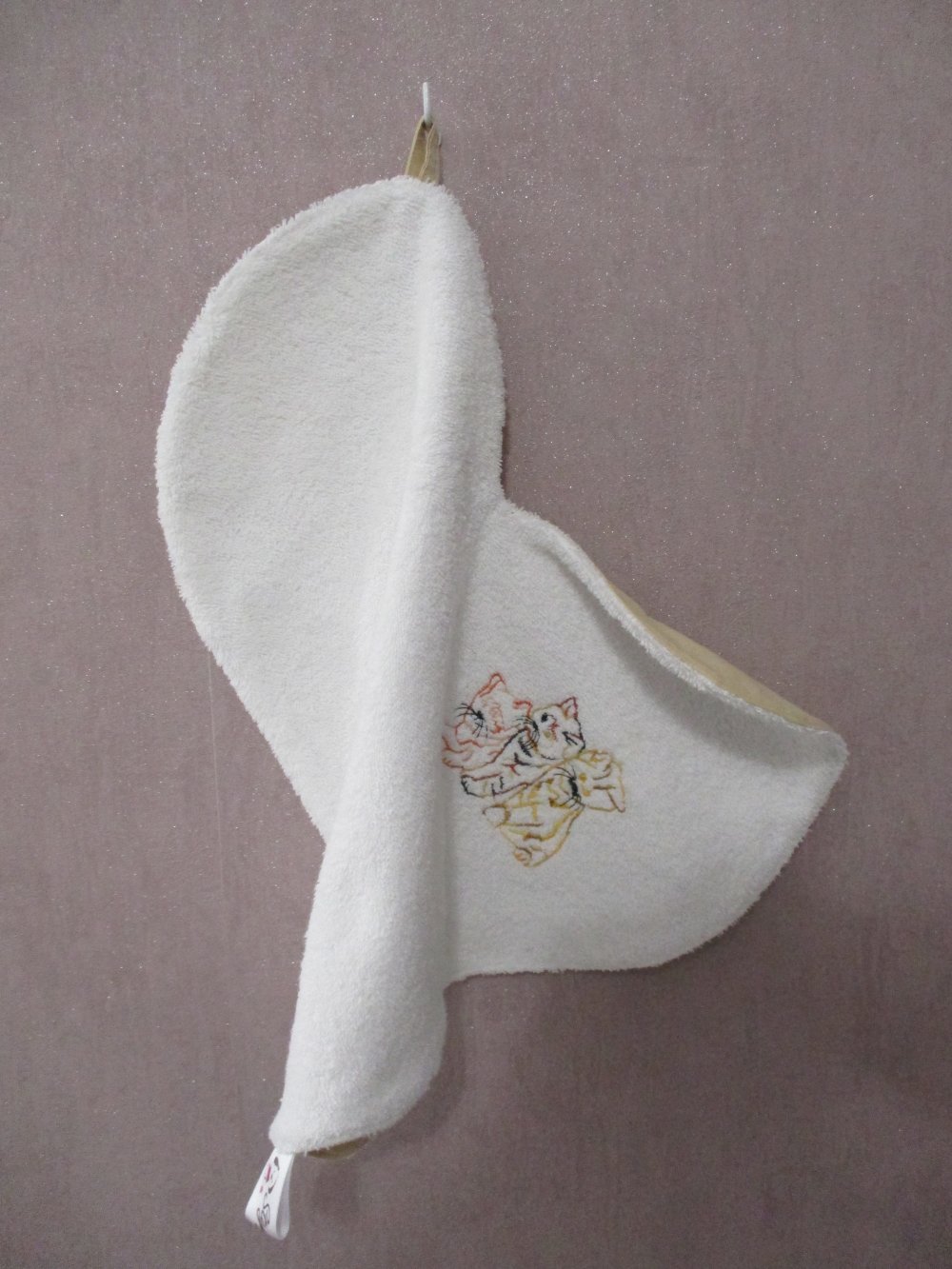 Cousu avec amour cet essuie-pattoune en éponge et coton peut même essuyer les mains des humains (mais attention nos compagnons risquent de râler).