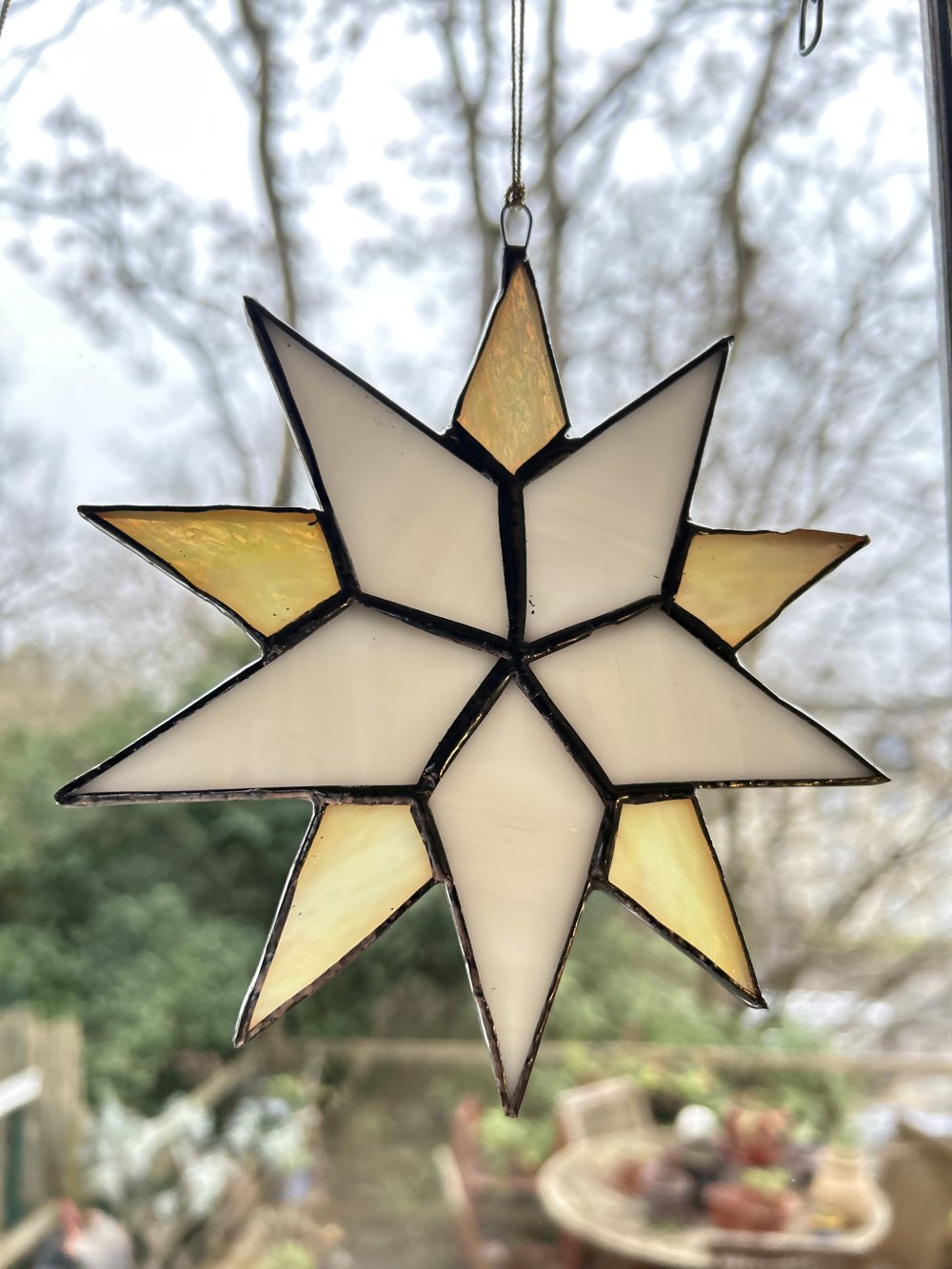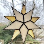 Grande étoile en verre irisé et verre opaque, qui égaiera votre intérieur de ses reflets changeants en fonction de la lumière.