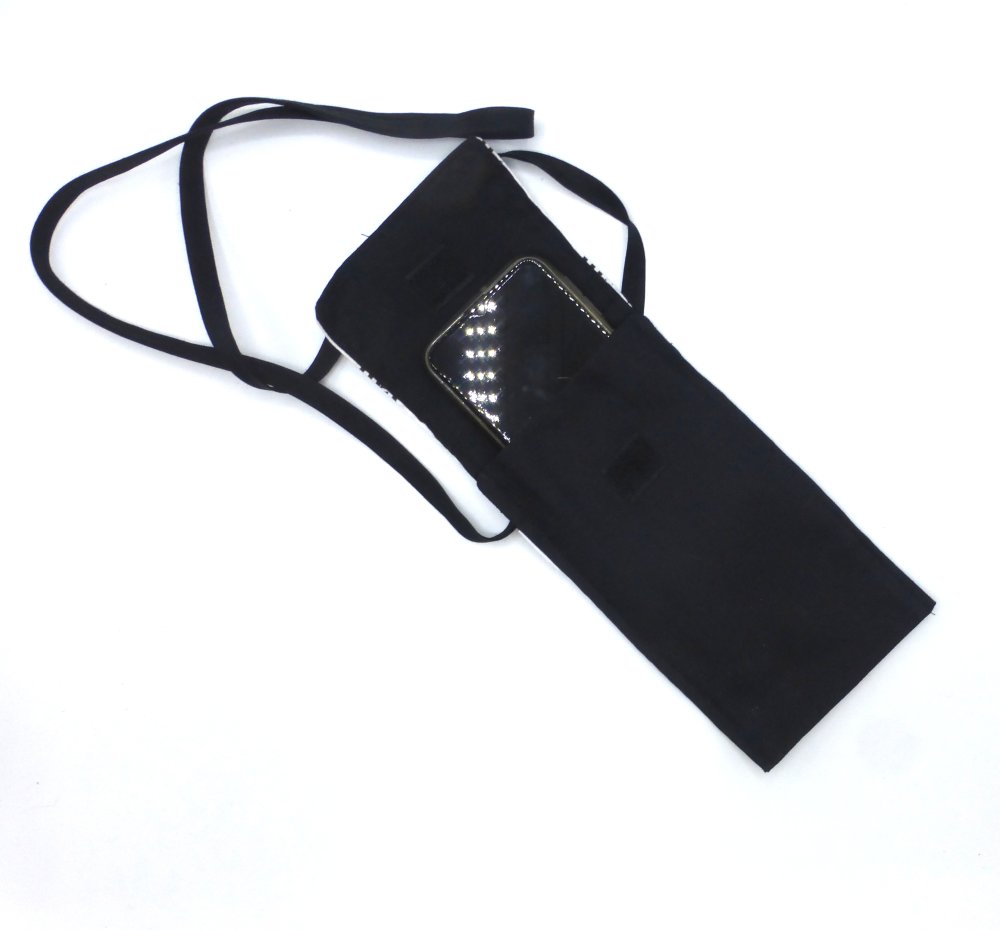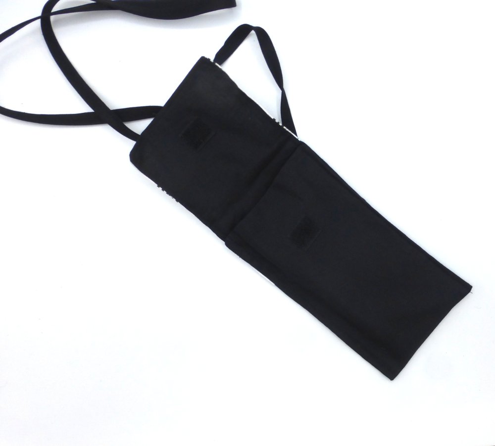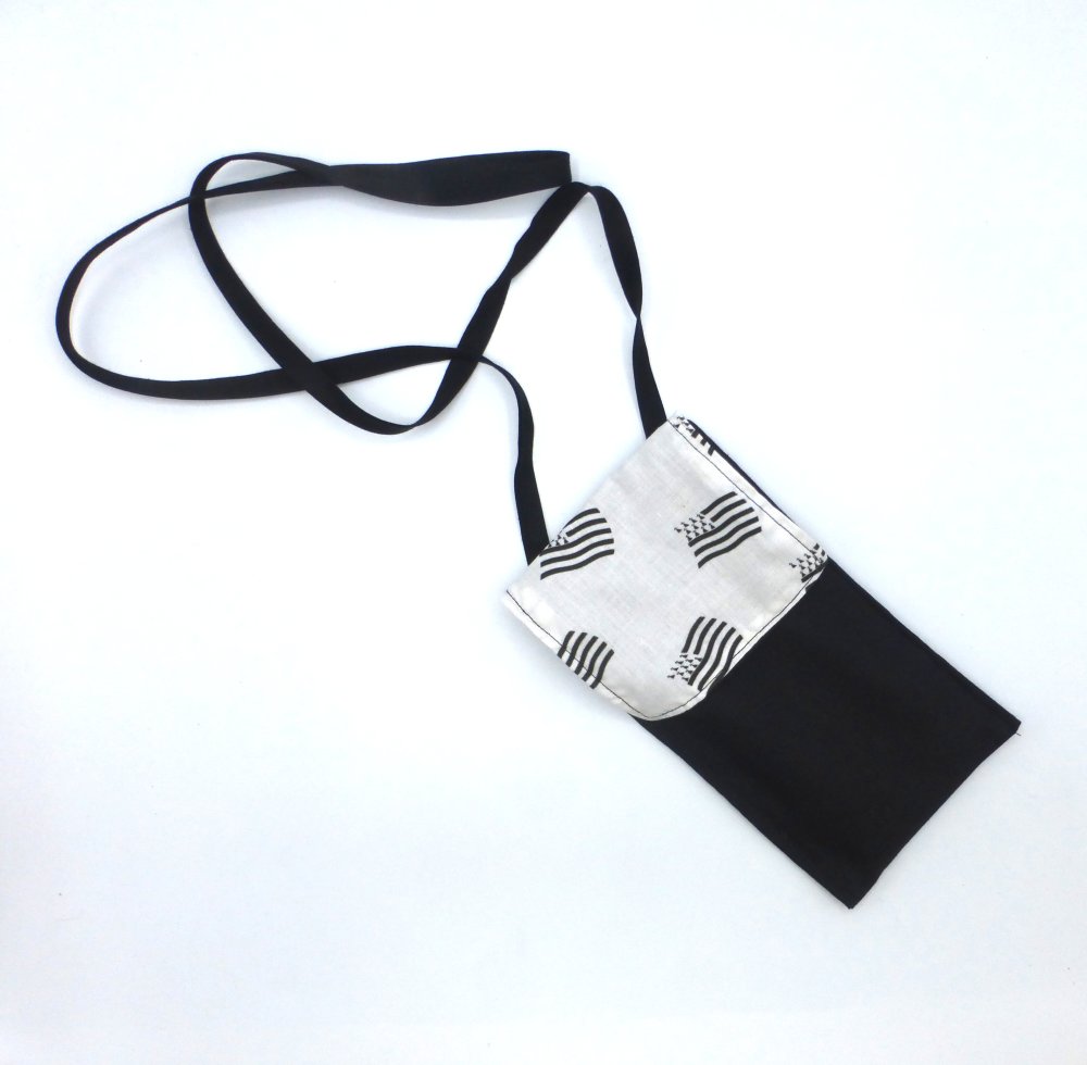Cet étui pour téléphone portable à bandoulières à motifs bretons est fabriqué avec du coton imprimé et du coton noir.