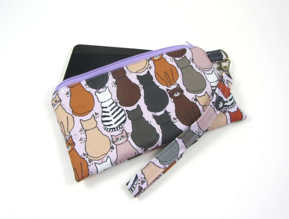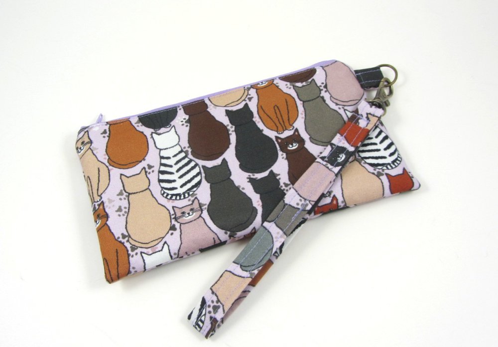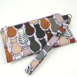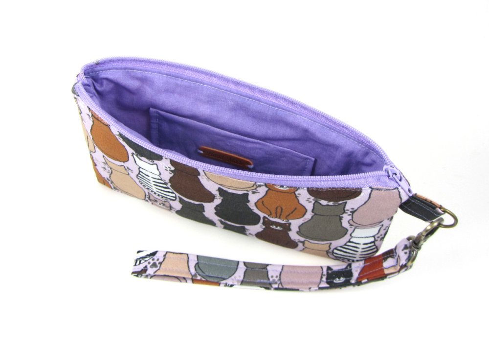 Réalisé en tissu imprimé chats, doublée et molletonnée avec une petite poche à l’intérieure pour la carte bancaire.