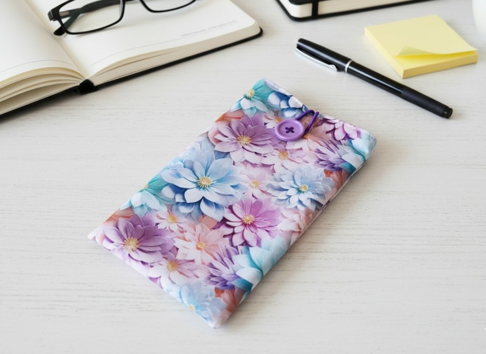 Elle est composée d'un tissu extérieur imprimé effet 3D fleurs, un tissu intérieur en coton uni lilas et doublée d'une fine ouate pour une meilleure protection de votre téléphone ou de vos lunettes. Fermeture par bouton avec élastique