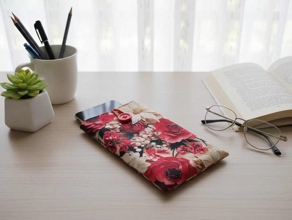 Elle est composée d'un tissu extérieur en coton/polyester imprimé effet 3D, un tissu intérieur en coton uni et doublée d'une fine ouate pour une meilleure protection de votre téléphone. Fermeture par bouton avec élastique