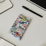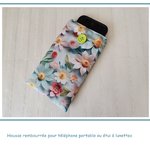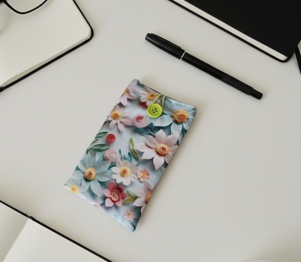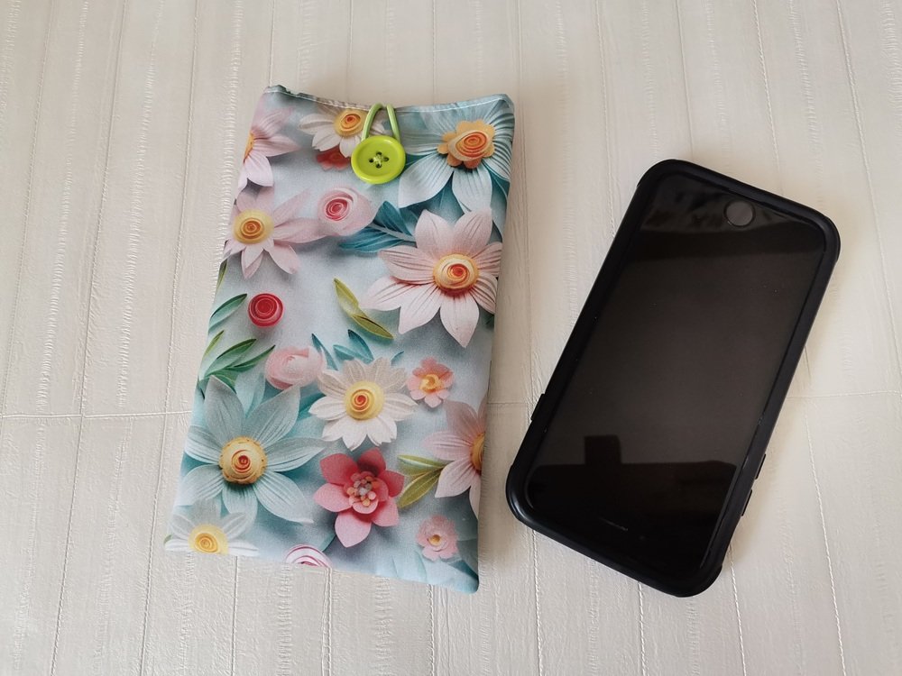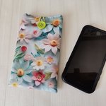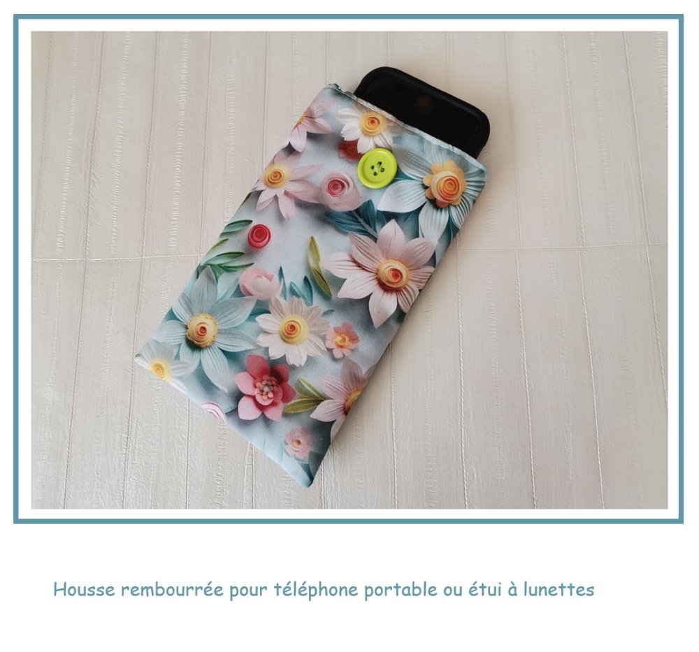 Elle est composée d'un tissu extérieur imprimé effet 3D fleurs, un tissu intérieur en coton uni vert pale et doublée d'une fine ouate pour une meilleure protection de votre téléphone ou de vos lunettes. Fermeture par bouton avec élastique