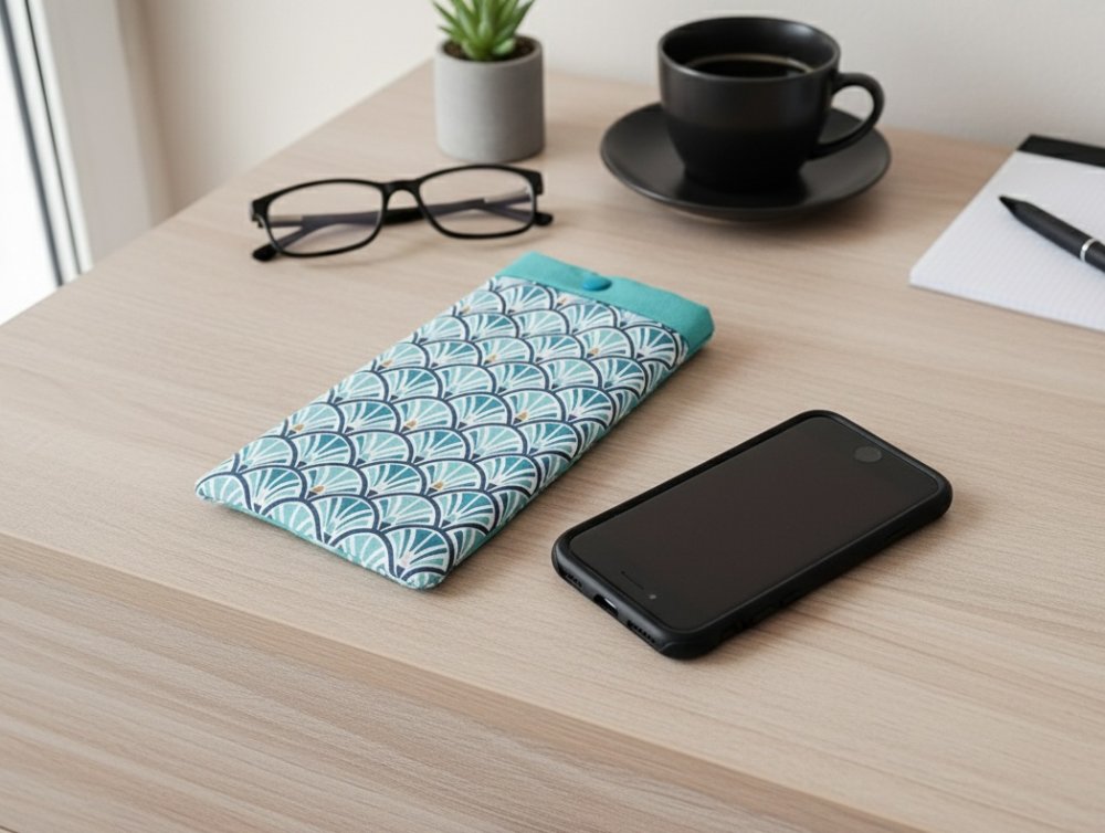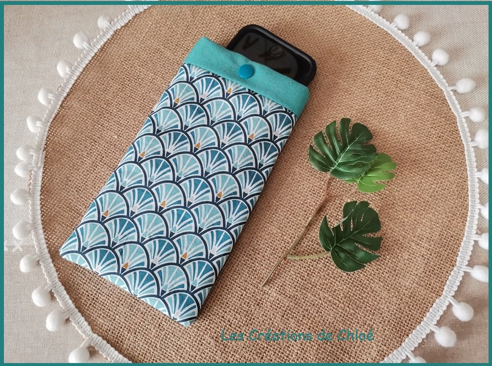 Elle est composée d'un tissu extérieur en coton certifié Oeko-Tex imprimé, un tissu intérieur en coton uni et doublée d'une fine ouate pour une meilleure protection de votre téléphone. Fermeture par bouton pression plastique.