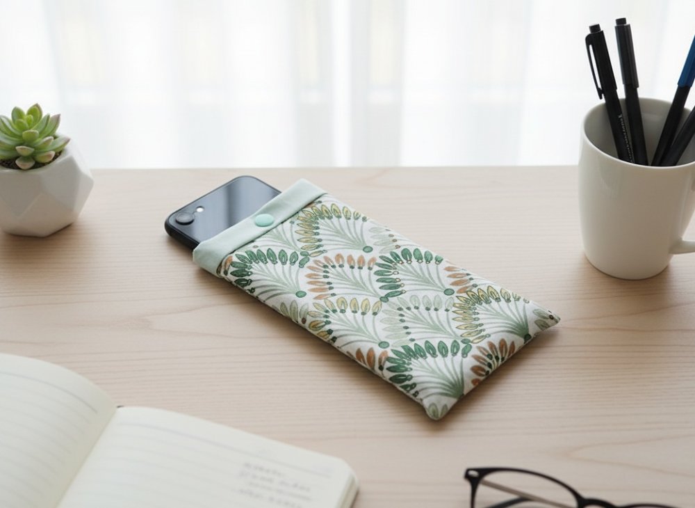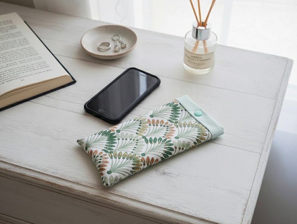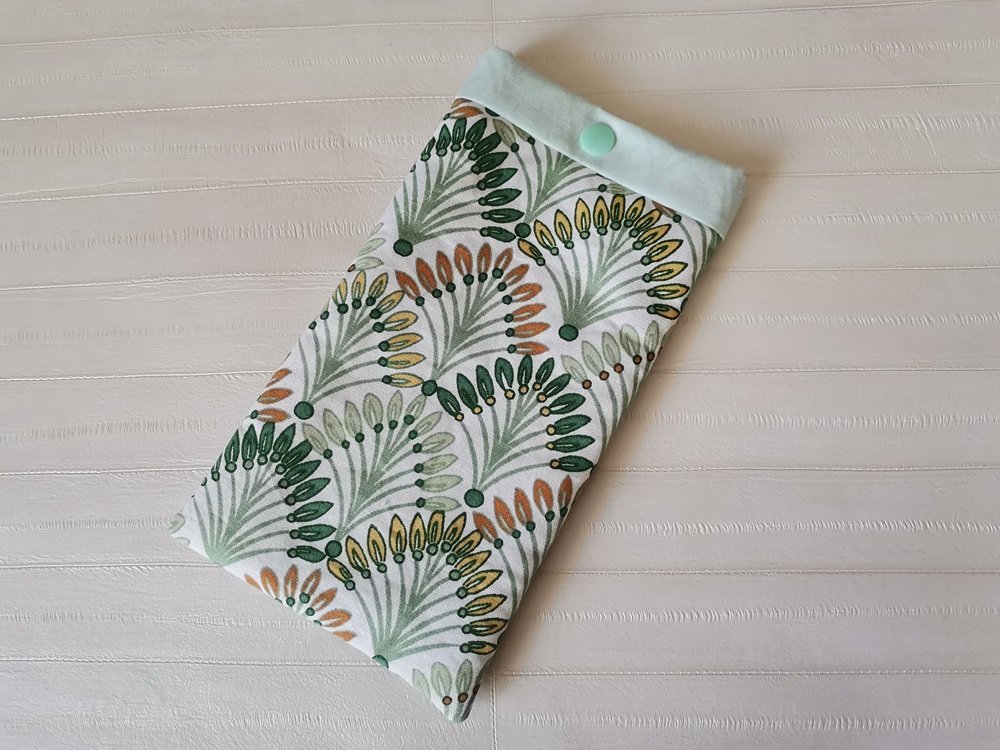 Elle est composée d'un tissu extérieur en coton certifié Oeko-Tex imprimé, un tissu intérieur en coton uni et doublée d'une fine ouate pour une meilleure protection de votre téléphone. Fermeture par bouton pression plastique (le bouton n'est pas en contact avec le téléphone).