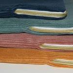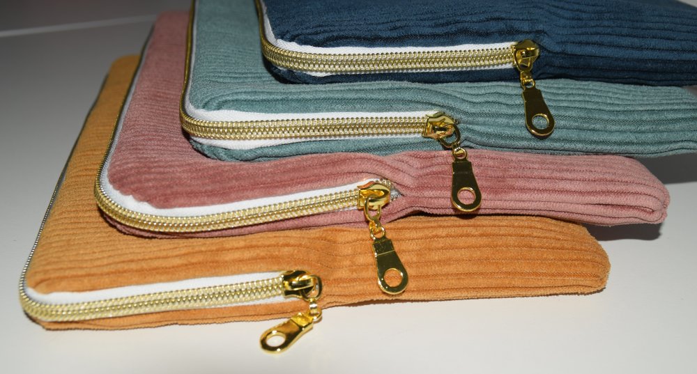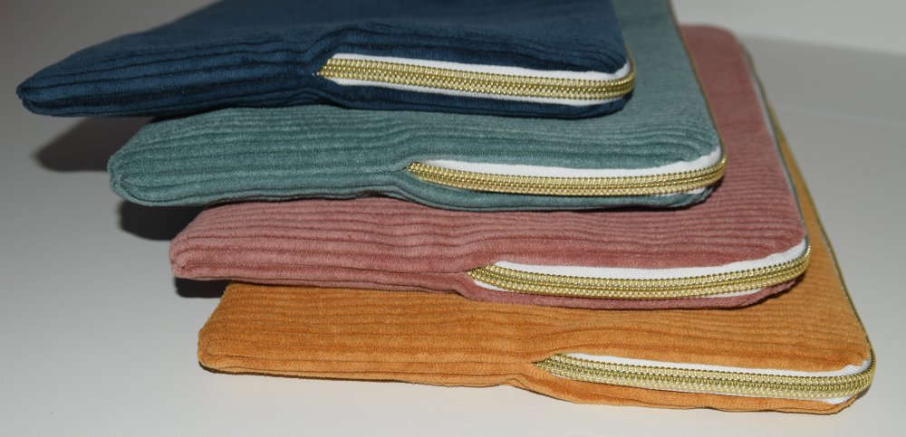 Elle est réalisée sur mesure dans un tissu en velours cotelé avec un intérieur blanc à pois doré. Elle est rembourée de ouate pour contrer les chocs! La fermeture éclair est dorée.