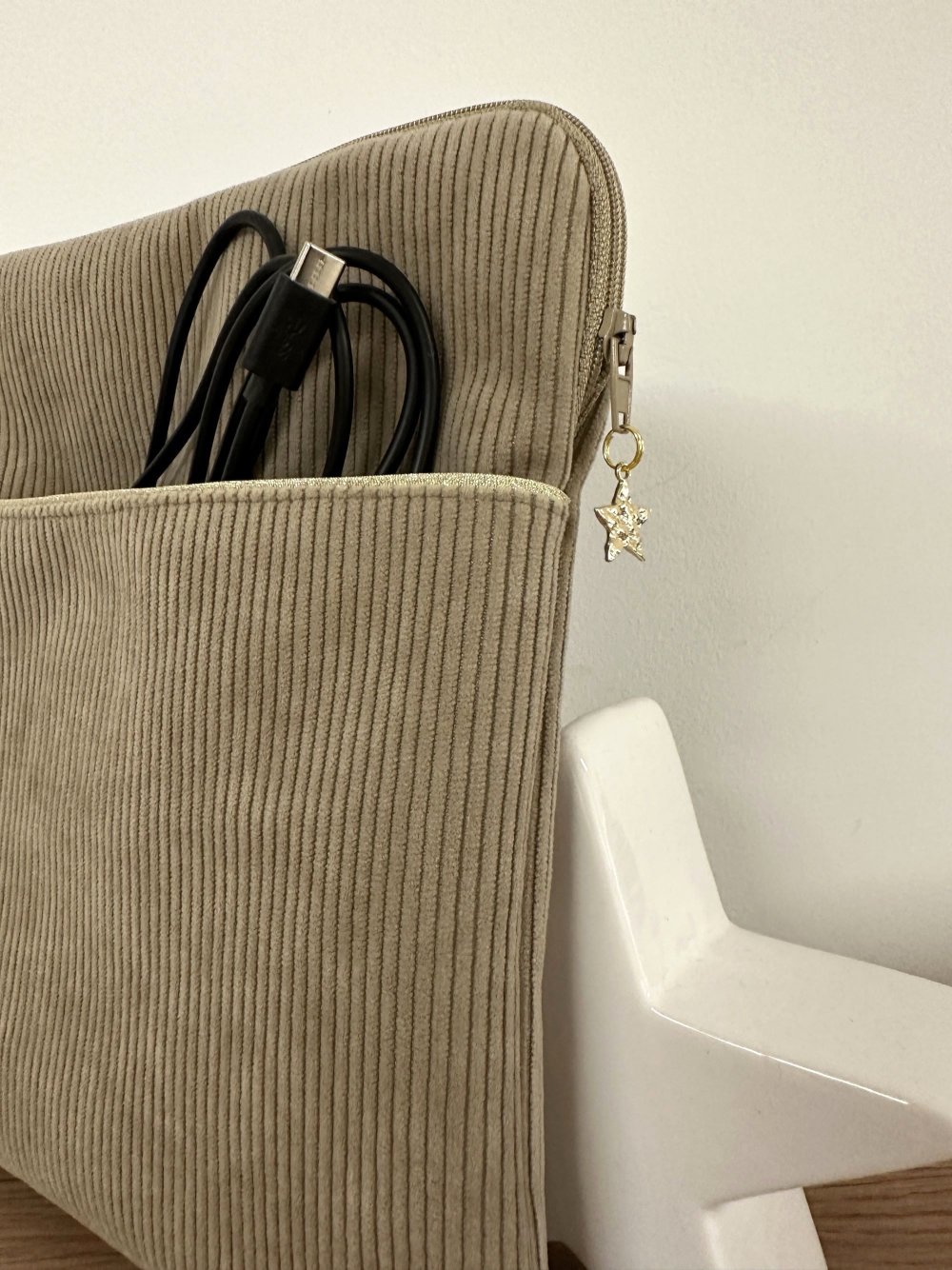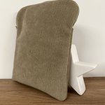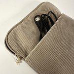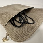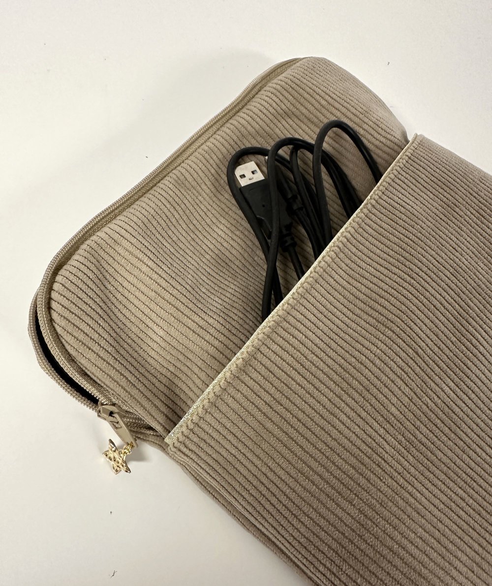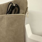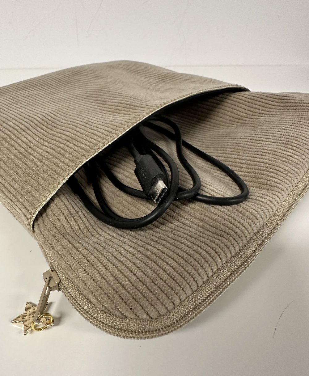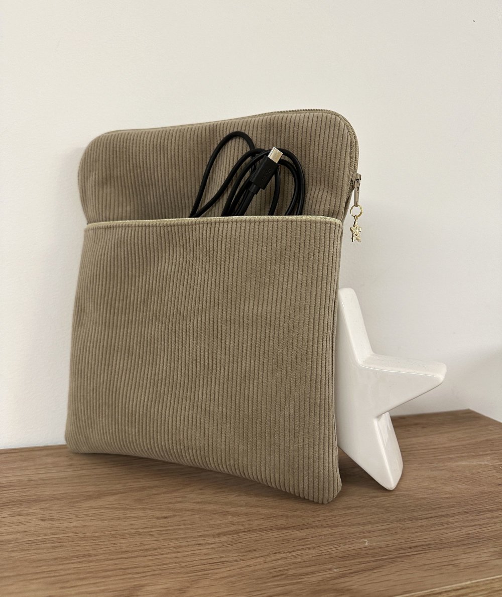 Une pochette zippée pour liseuse ou tablette en velours cotelé beige avec poche chargeur, réalisée sur mesure