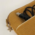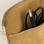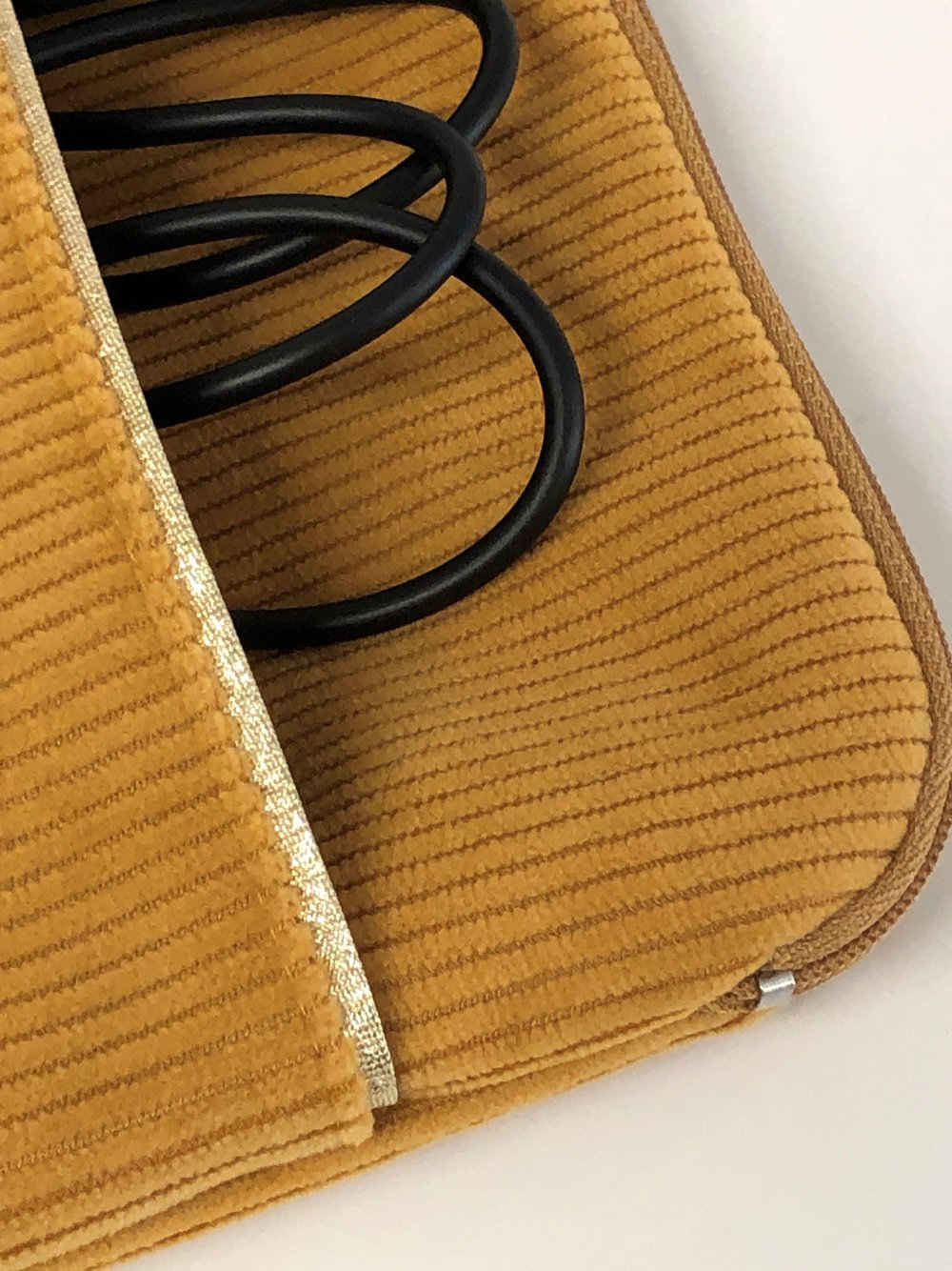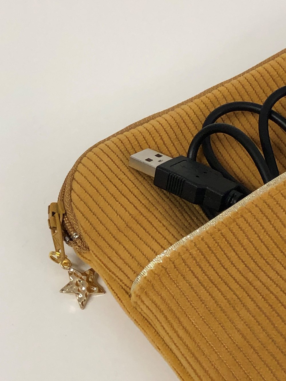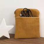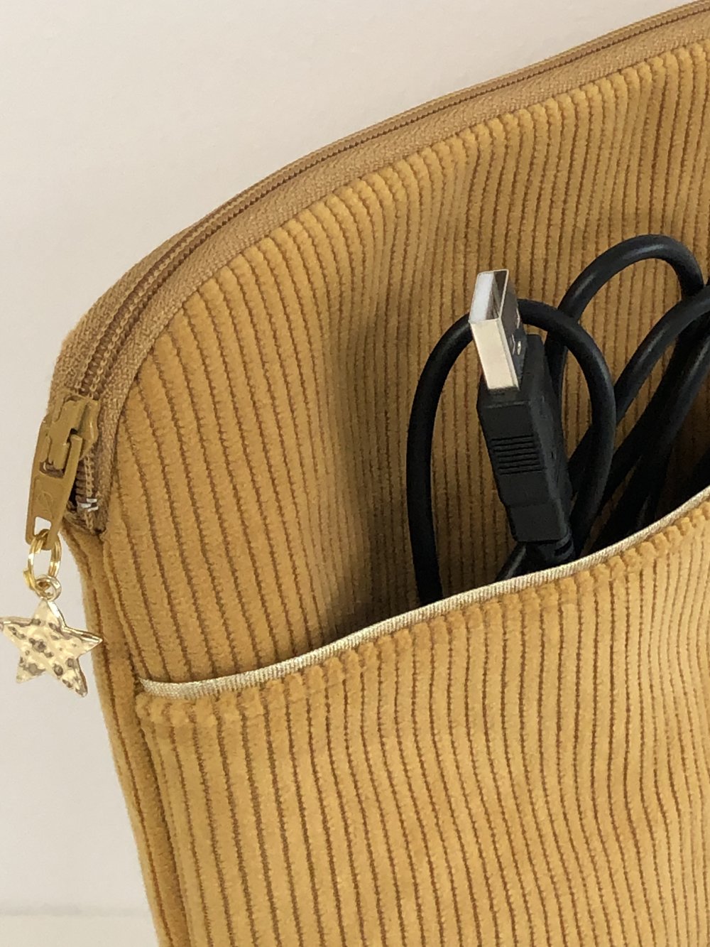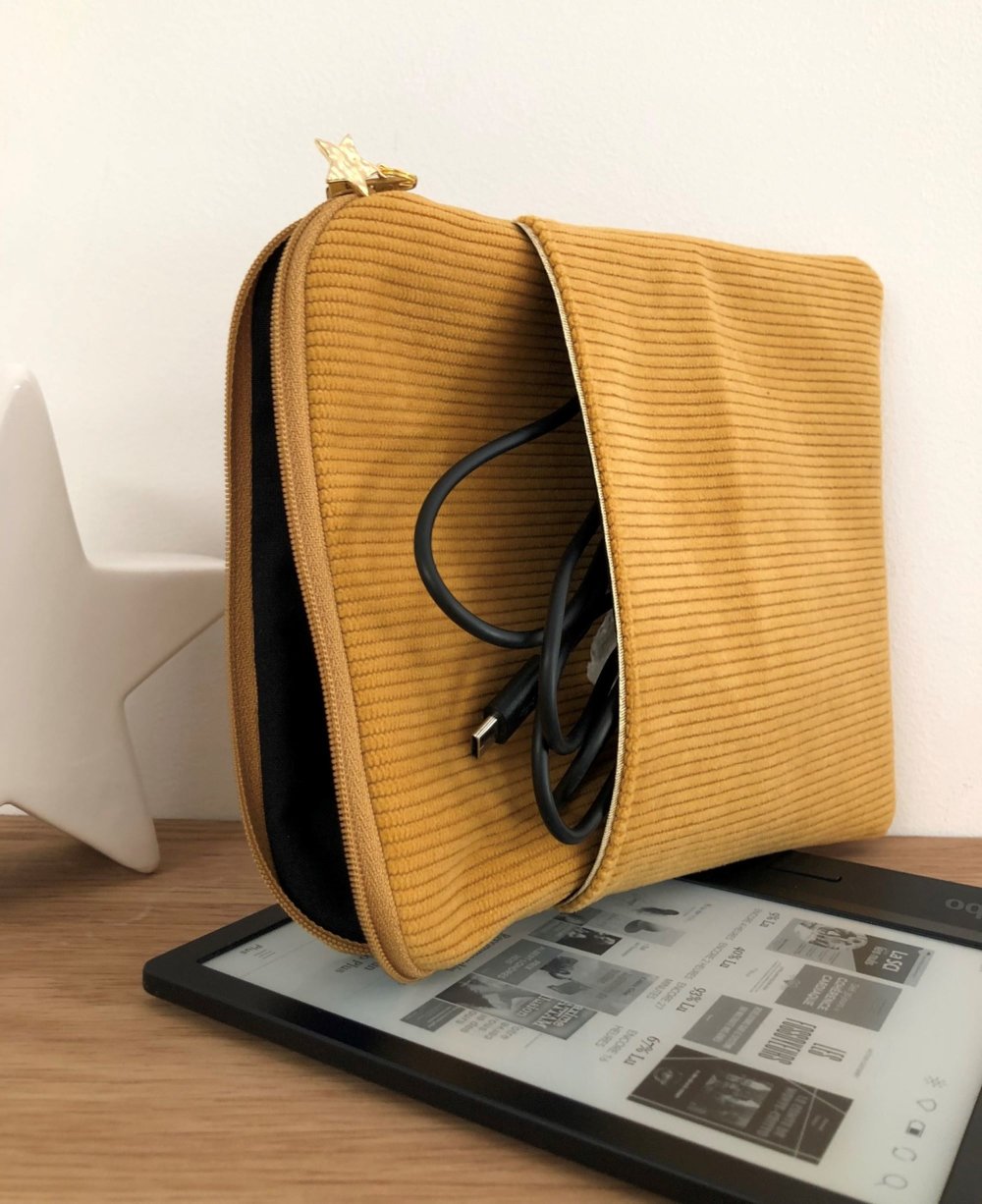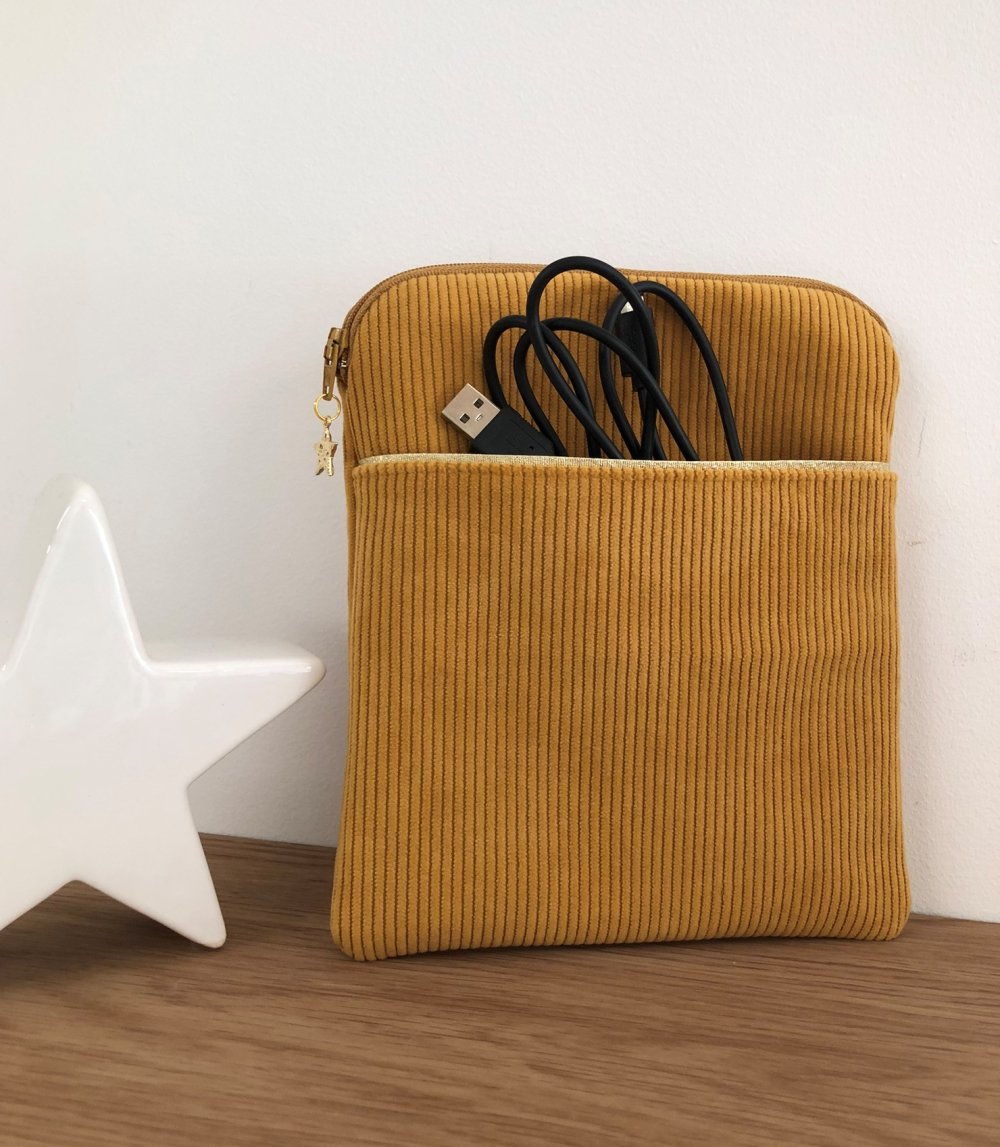 La pochette zippée pour liseuse ou tablette en velours cotelé jaune moutarde avec poche chargeur, réalisée sur mesure