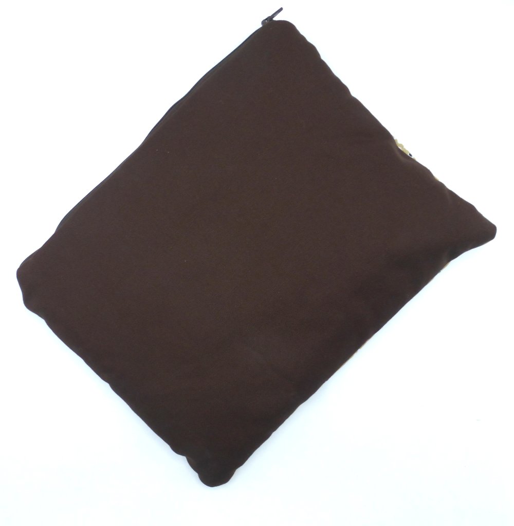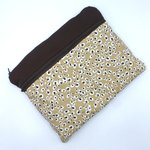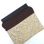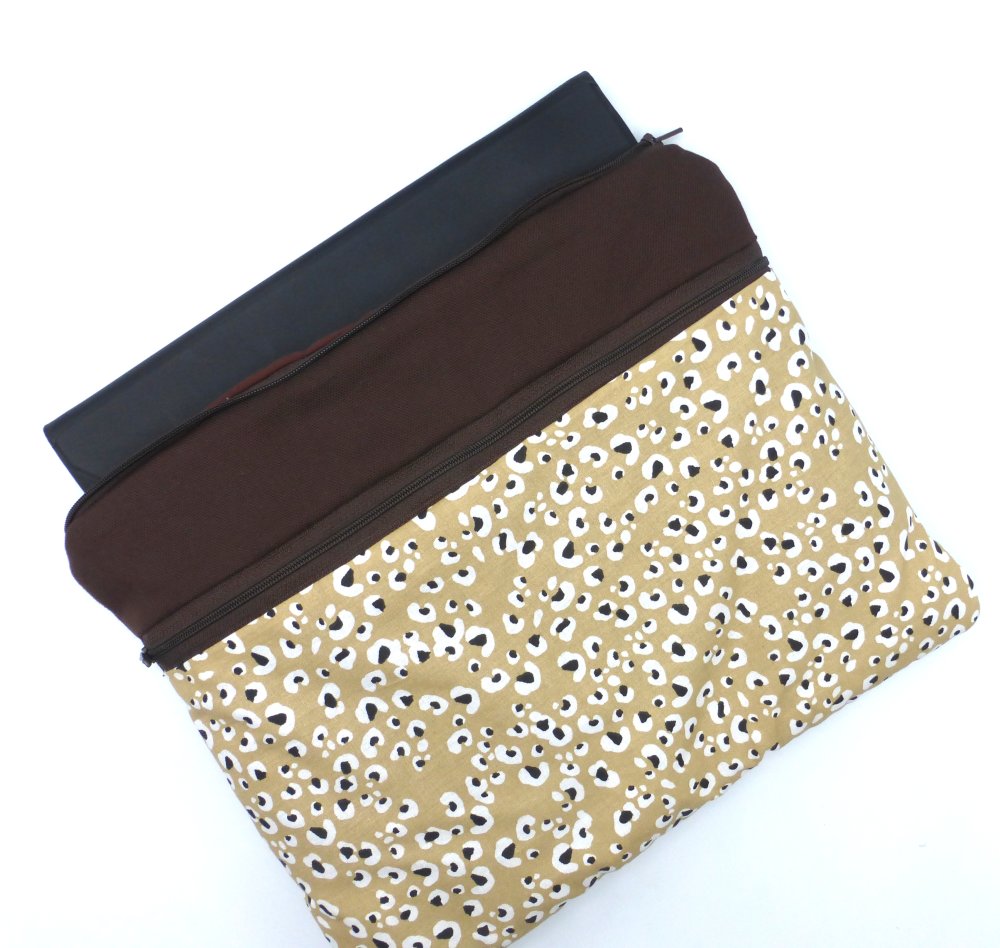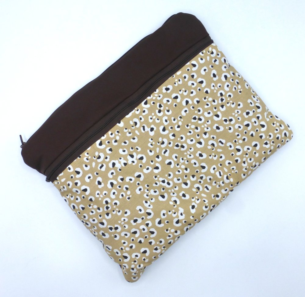 Grande pochette zippée molletonnée pour tablette 10 pouces, en coton imprimée motif peau de léopard et coton uni marron chocolat.