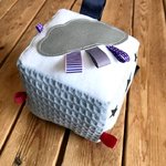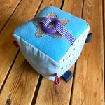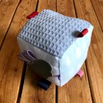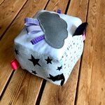Cube d'éveil à rubans en coton, jersey, polaire et feutre qui fera un chouette cadeau à offrir pour les tout-petits.