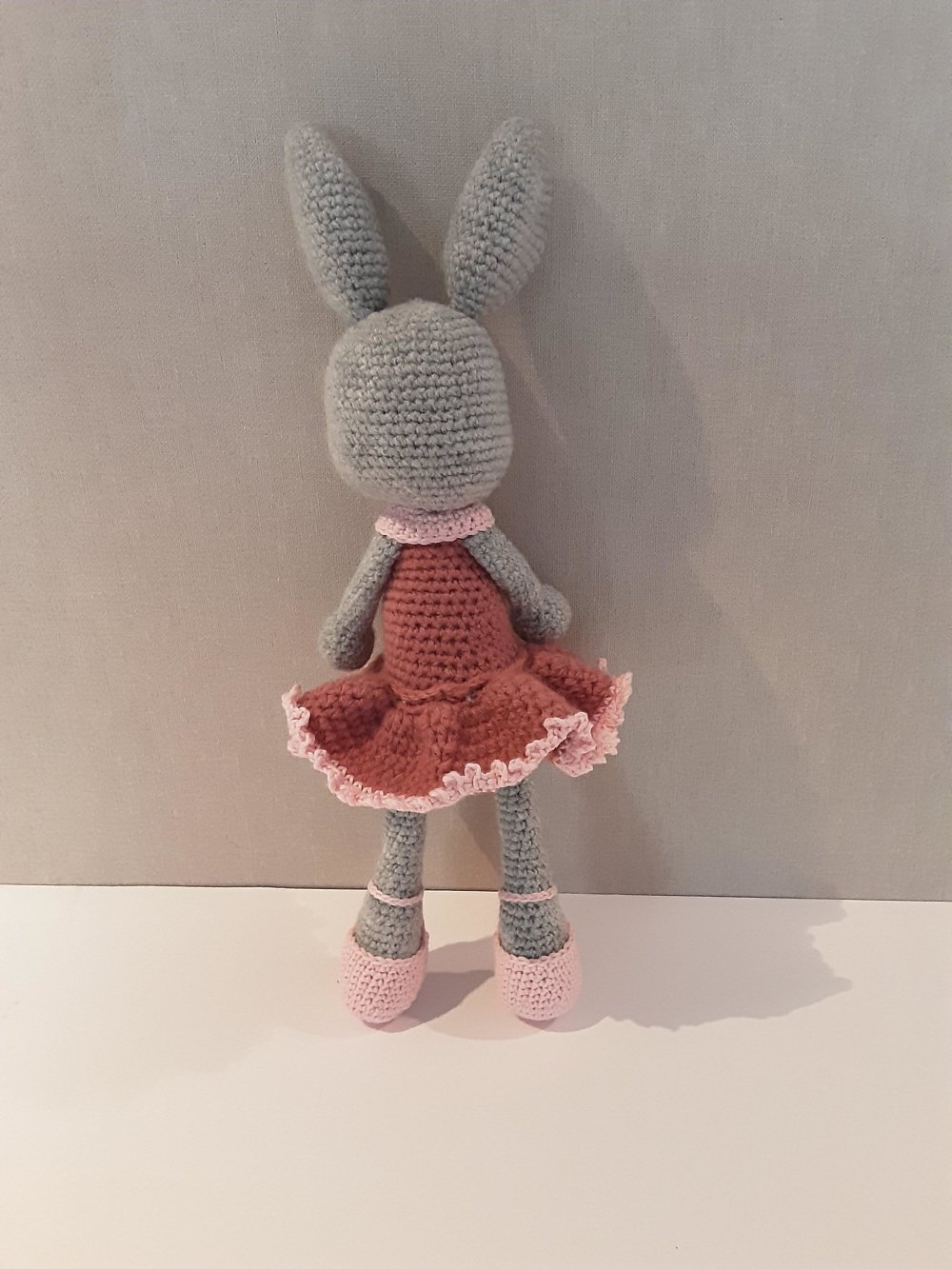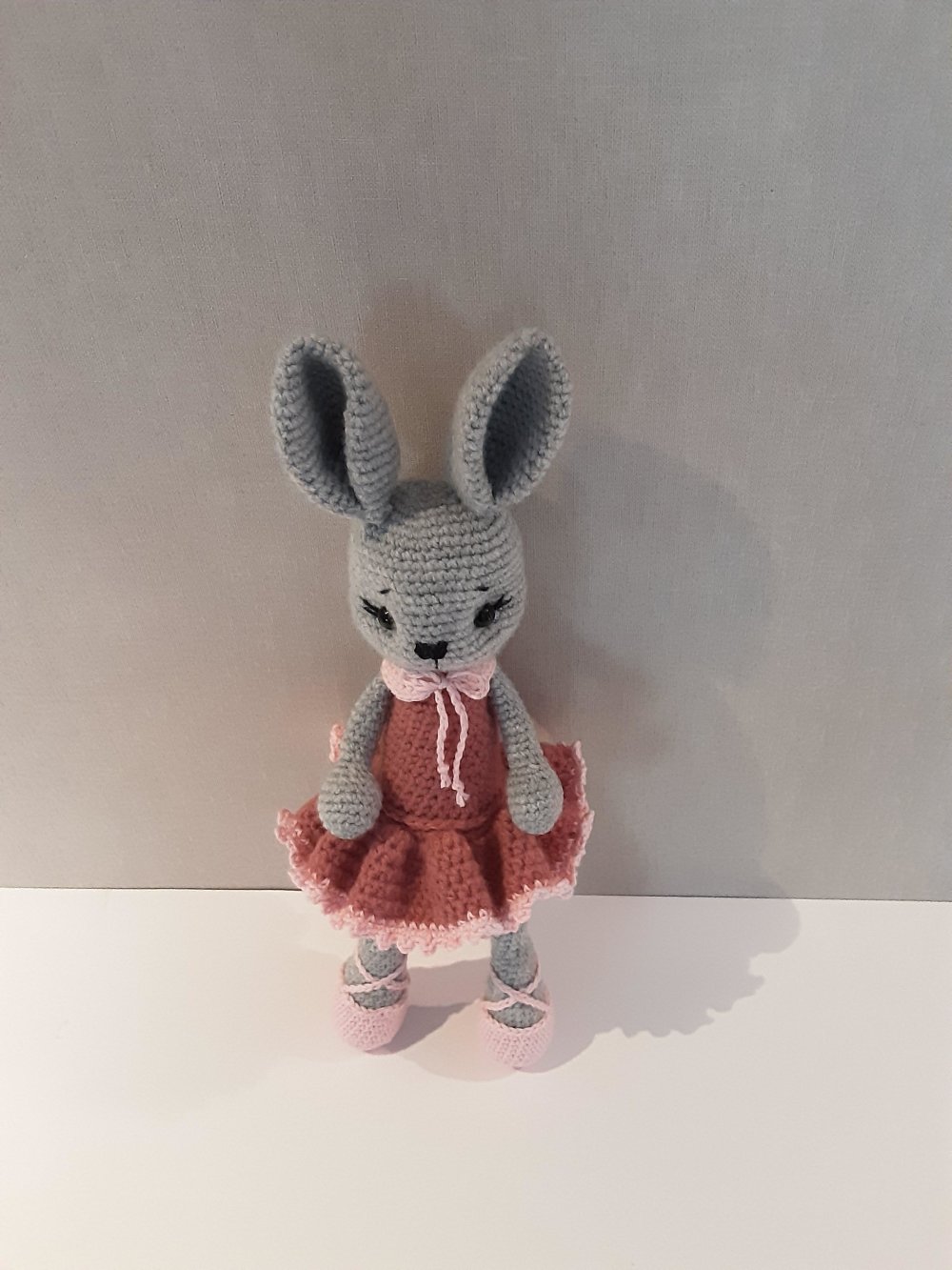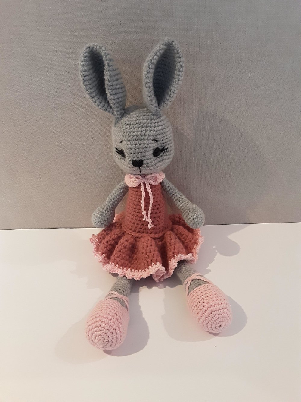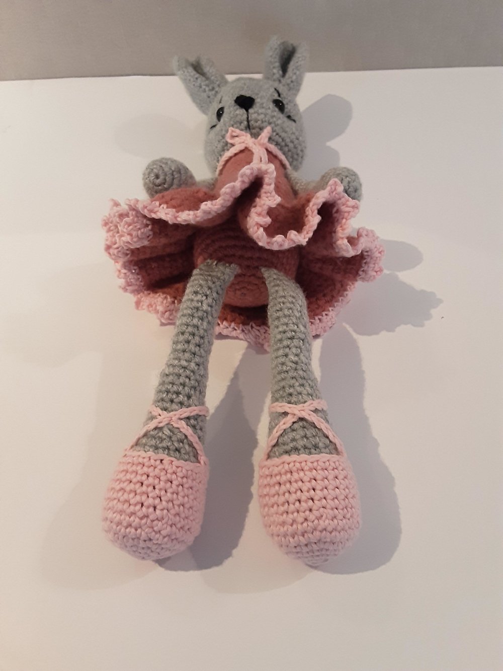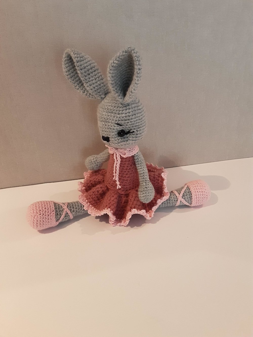 petite ballerine lapine réalisée au crochet en laine et coton ,bois de rose et rose clair