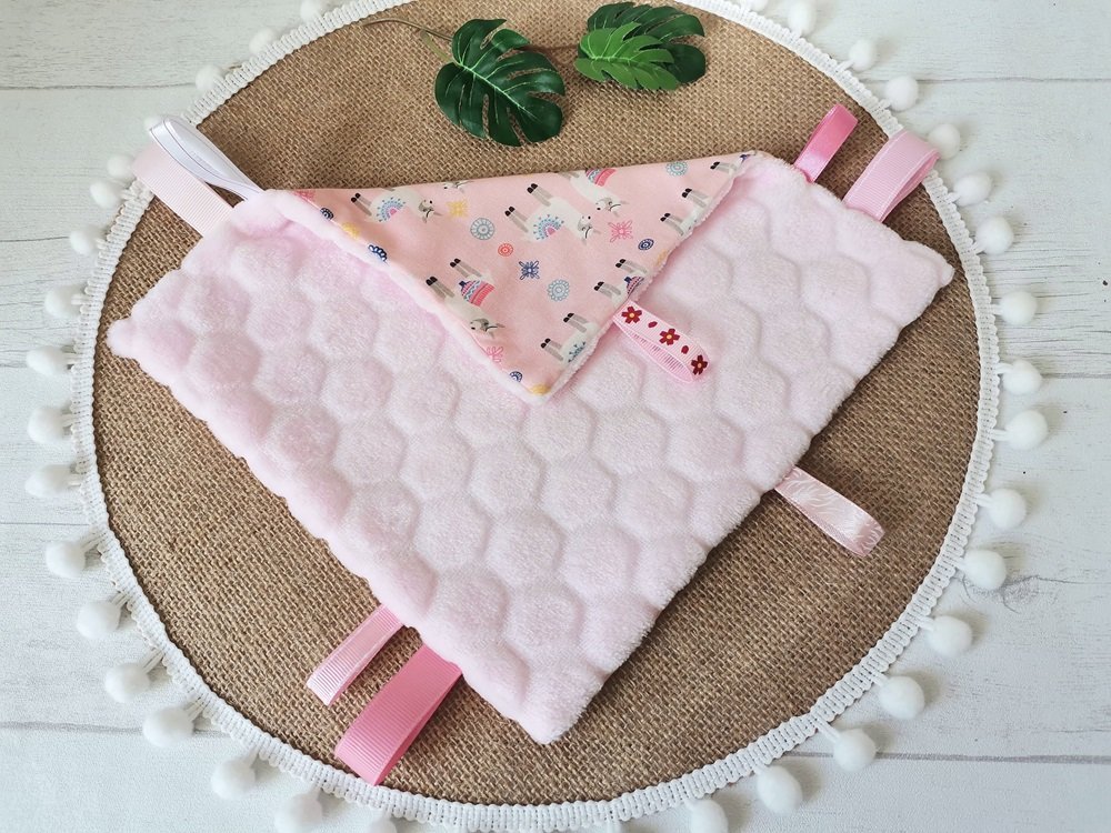 Doudou carré étiquettes parfait pour l'éveil de bébé .