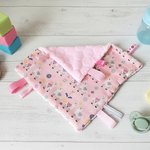 Doudou carré étiquettes parfait pour l'éveil de bébé .