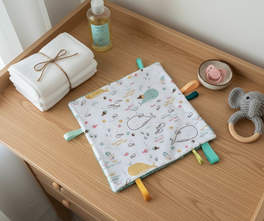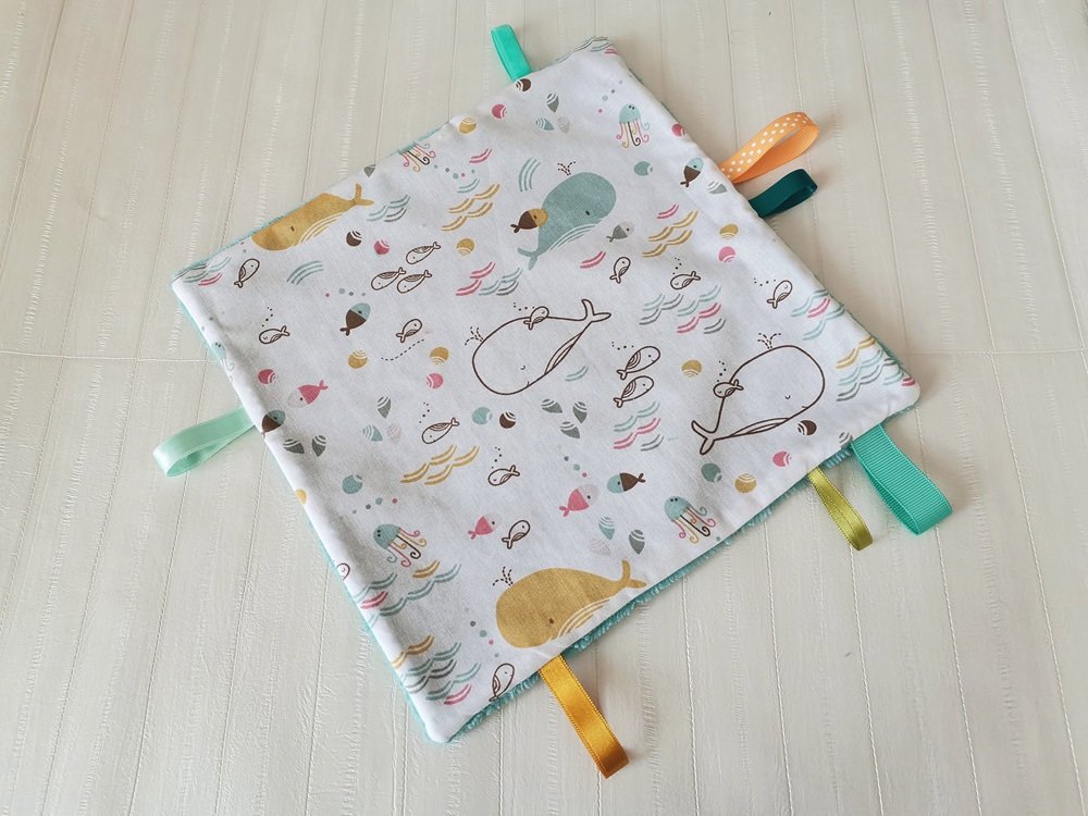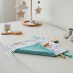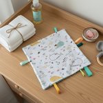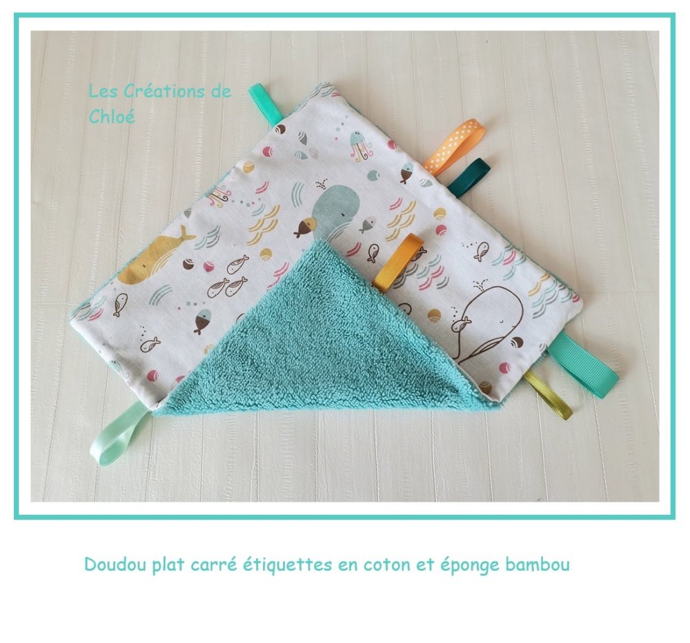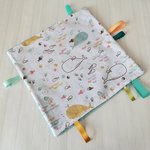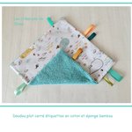 Doudou carré étiquettes parfait pour l'éveil de bébé .