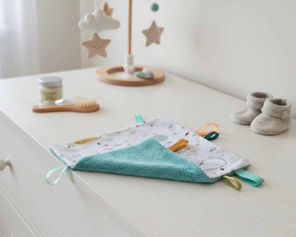 Un coté tout doux en tissu éponge bambou de couleur verte, l'autre face en coton certifié Oeko-Tex imprimé baleines et avec diverses