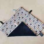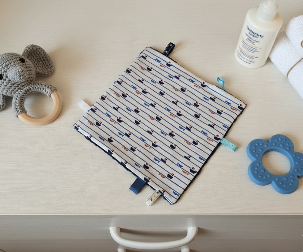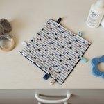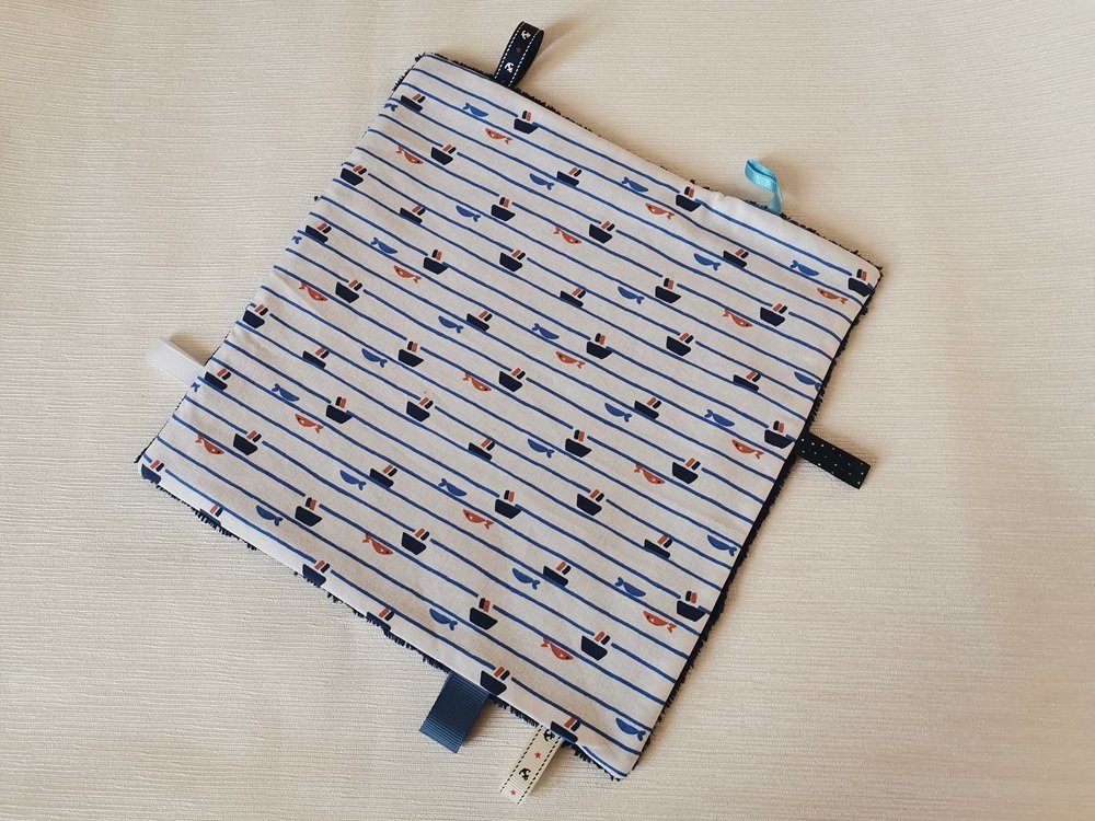 Doudou carré étiquettes parfait pour l'éveil de bébé .
