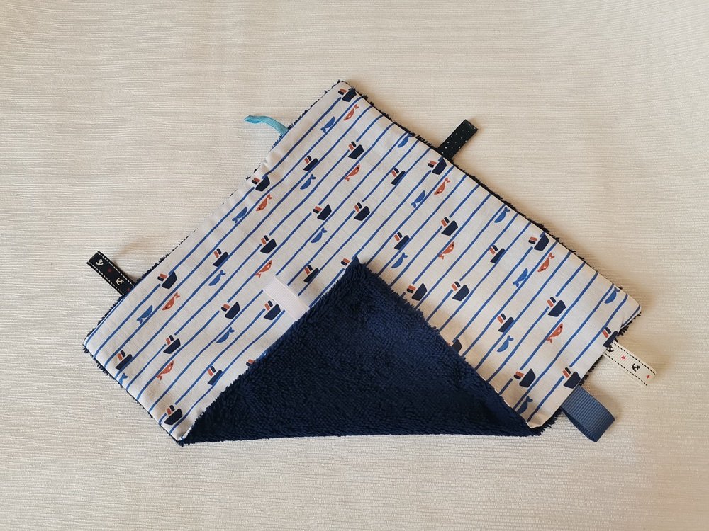 Un coté tout doux en tissu éponge bambou de couleur bleu marine, l'autre face en coton certifié Oeko-Tex imprimé et avec diverses