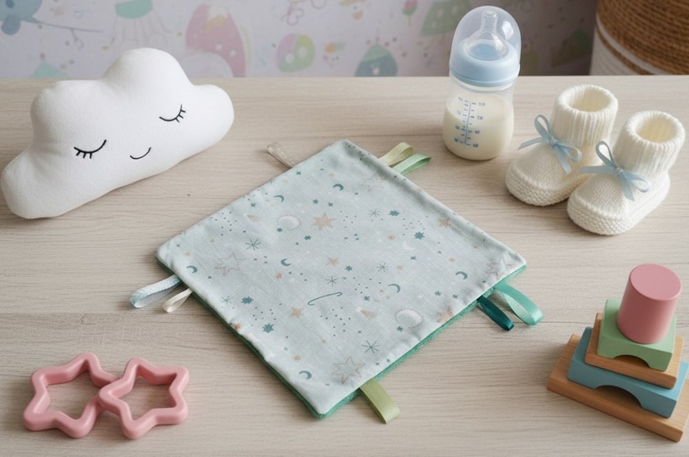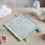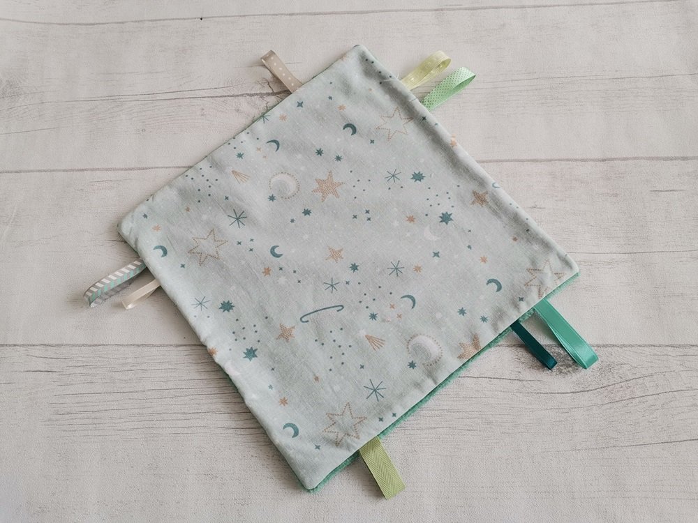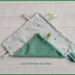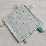Doudou carré étiquettes parfait pour l'éveil de bébé .