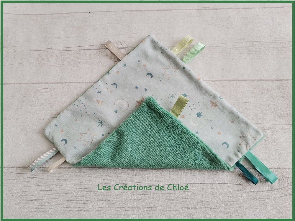 Un coté tout doux en tissu éponge bambou de couleur verte, l'autre face en coton certifié Oeko-Tex imprimé étoiles.