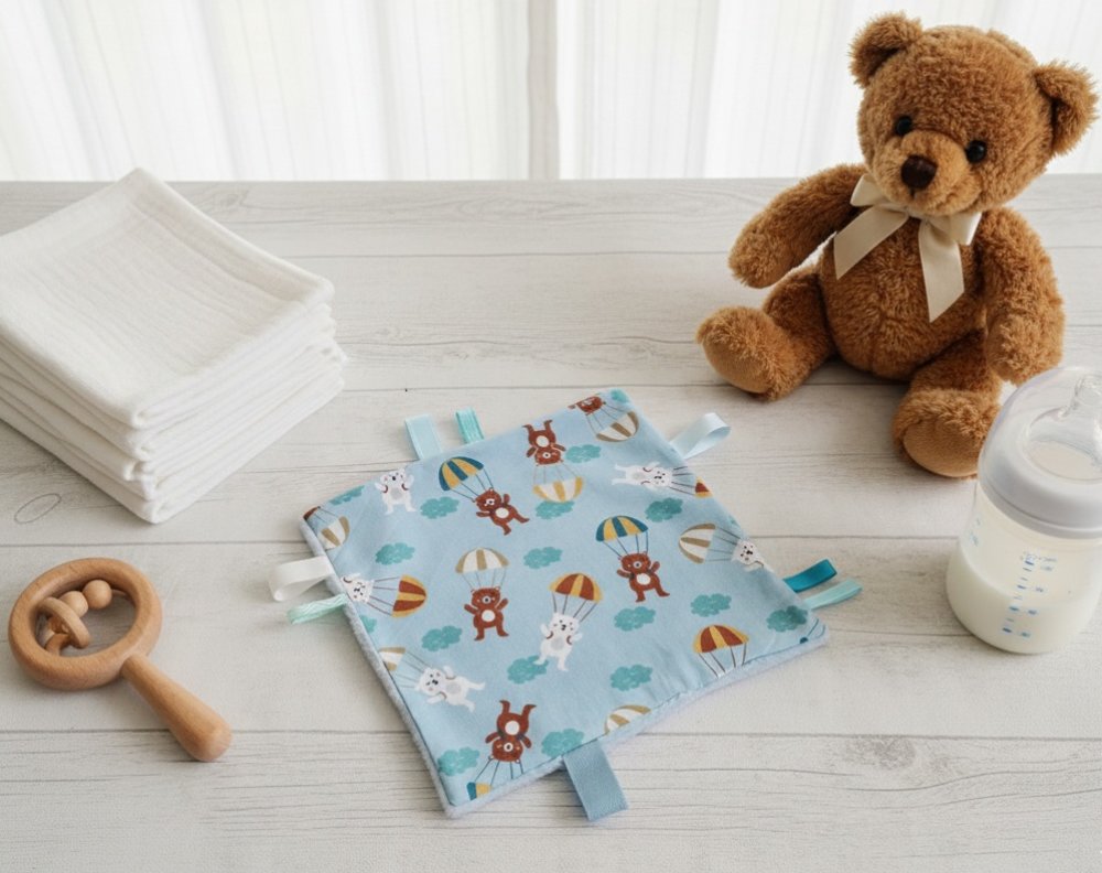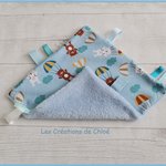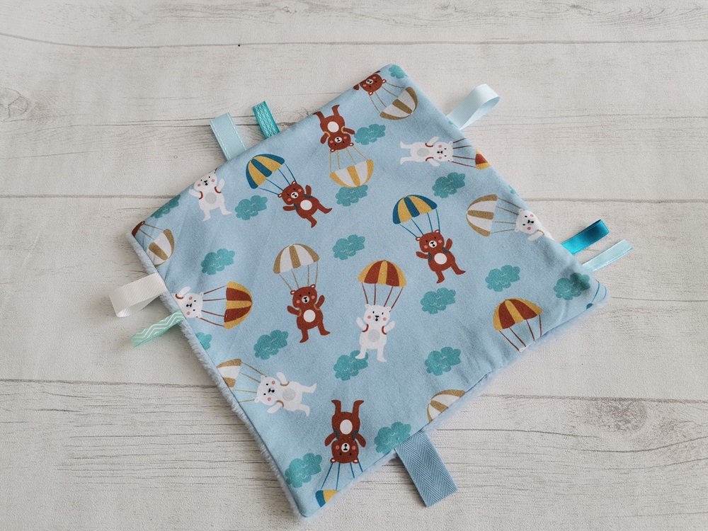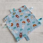 Doudou carré étiquettes parfait pour l'éveil de bébé .